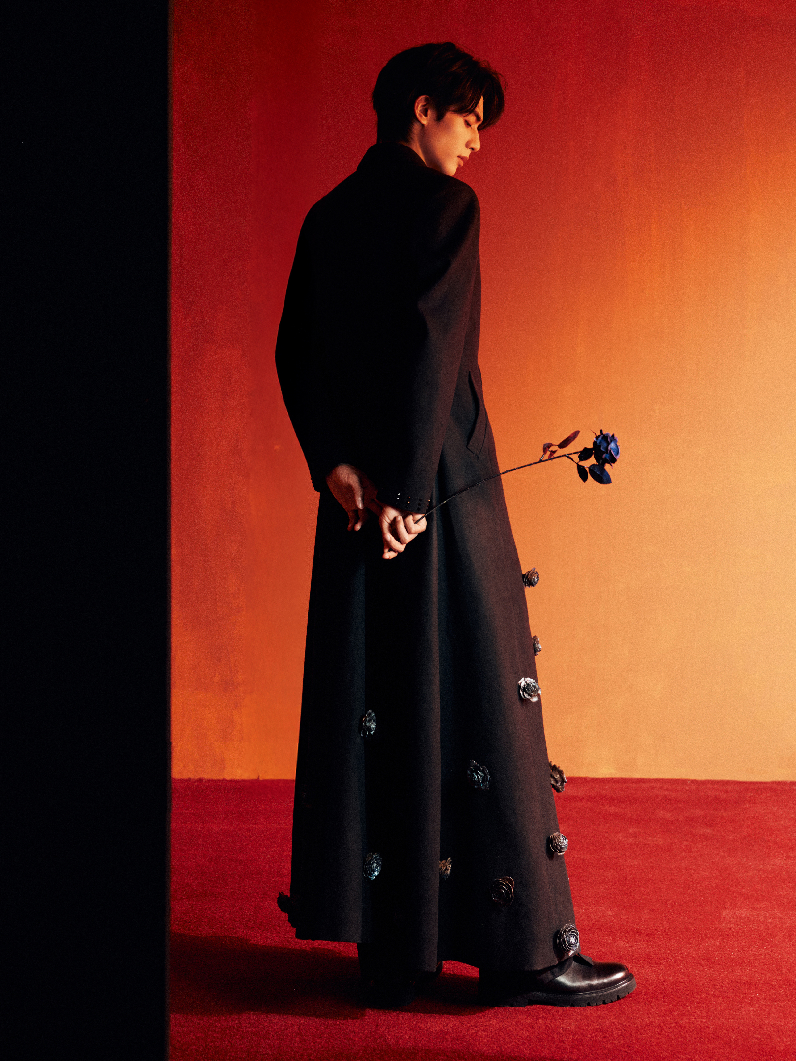 第二套蓝玫瑰定制大衣,墨色衣身缀满深蓝花瓣,完美呼应"花园盛典"主题,MIKIMOTO珠宝胸针添上点睛之笔,冷艳玫瑰与莹润珍珠碰撞出极致浪漫,步履间如暗夜繁花绽放。