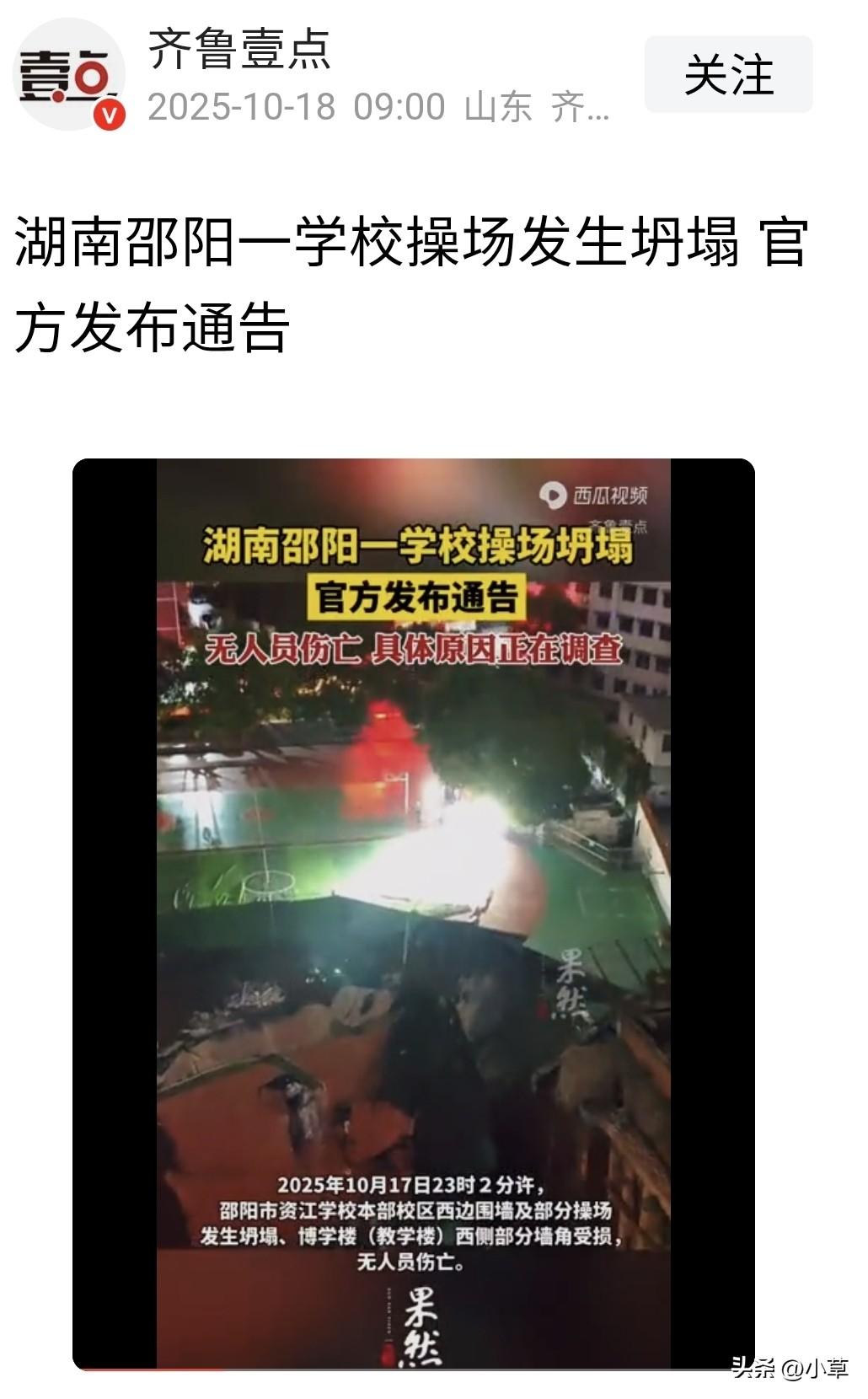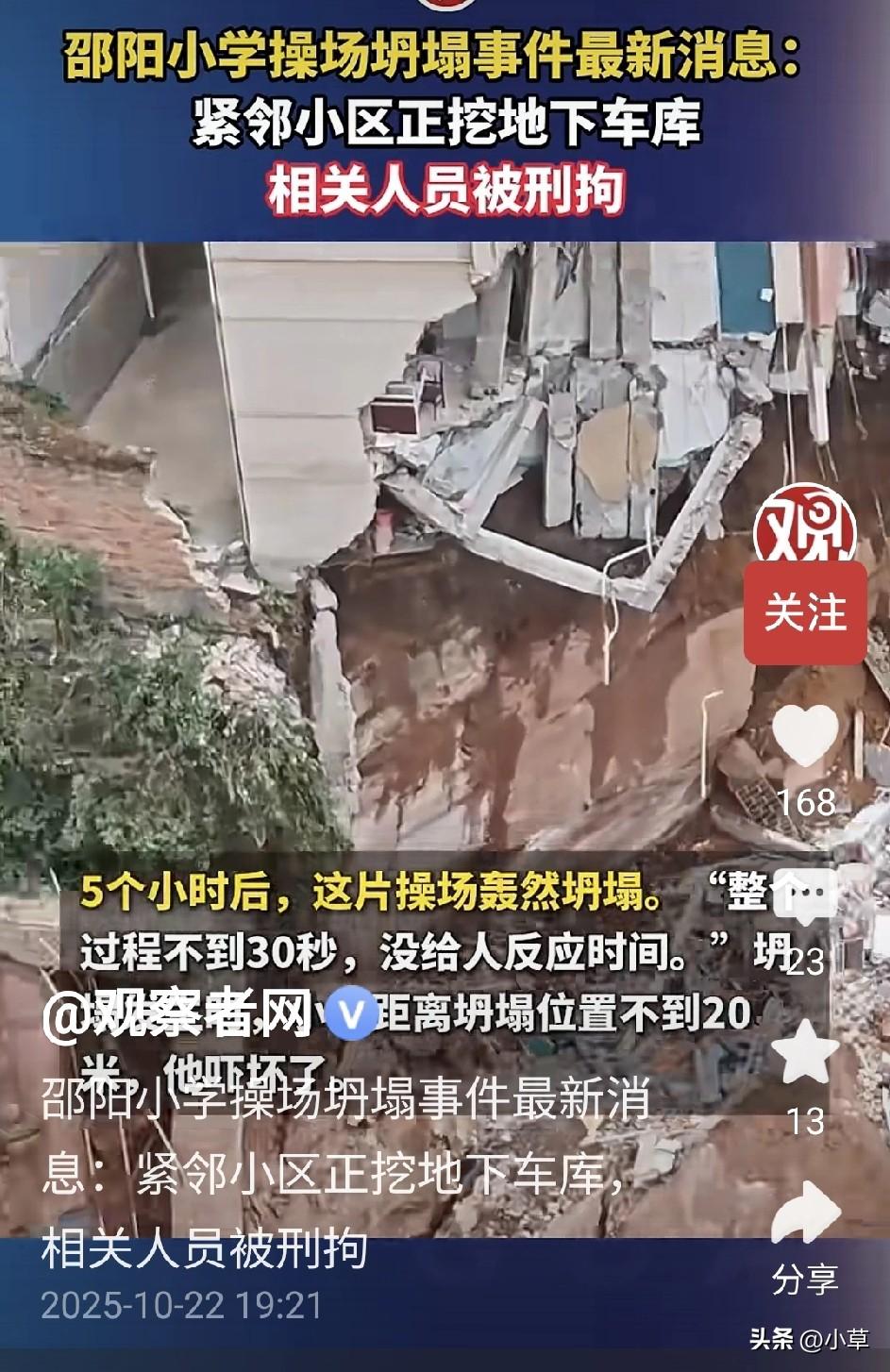太惊人了,10.17日晚 湖南邵阳资江学校本部操场发生塌方, 博学楼西部墙角受损。 虽然无人员伤亡,但是学校操场全部塌完了。 塌陷里面发现很多竹子埋在下面。 有网友说,是不是把竹子当钢筋了。 你说这豆腐渣工程真是害人不,还好是晚上塌方, 如果是白天,学生在操场玩耍,岂不是更可怕,后果简直不堪设想…… 今天事故原因调查出来 是紧邻学校的文明家园小区正在建设地下车库,开发商涉嫌违规超挖(原规划1层车库+泳池,实际开挖3层以上)。 截止目前为止开发商和施工方相关人员已被刑事拘留,市政府组织业主会议通报调查进展。 指出该操场3年前曾出现裂缝,当时仅作简单封闭维修。 这么大的安全隐患,完全可以应该提前预警,可以有效降低损失。教学楼事故 教学楼护栏坍塌