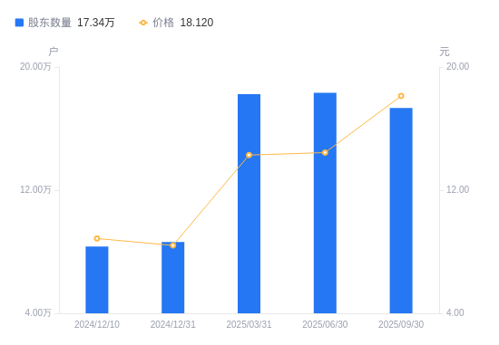 日期A股户数(户)流通A股户均持股数(股)户均持股市值(万元)2025-09-301734465807.3210.522025-06-301832315485.347.922025-03-311823025513.297.872024-12-318635511638.979.792024-12-108332112062.7910.692024-09-308332112062.799.722024-06-308092912673.219.022024-03-318091112689.3811.502023-12-318323012335.8212.482023-09-308698211803.7112.42
