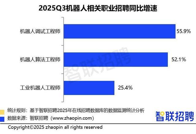 机器人领域的招聘增速也呈现较快增长。三季度,机器人调试工程师、算法工程师、工业机器人工程师的职位数同比增速分别为55.9%、52.1%、25.4%。服务机器人(家庭/配送)、特种机器人(安防/救援)等新兴民用赛道正加速突破“技术—场景适配”瓶颈,新产品落地急需调试、算法类人才填补“技术到商用”的衔接缺口。
