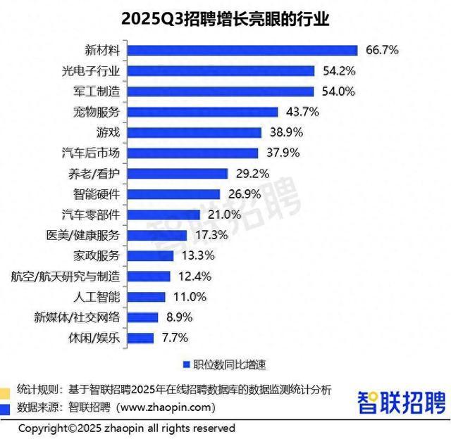 近日,招聘平台(智联招聘)发布《2025年三季度人才市场热点快报》显示,今年三季度先进制造业、现代服务业招聘增速继续领跑,其中新材料、光电子等行业招聘增速超50%。同时,短剧等相关人才需求明显上涨。
