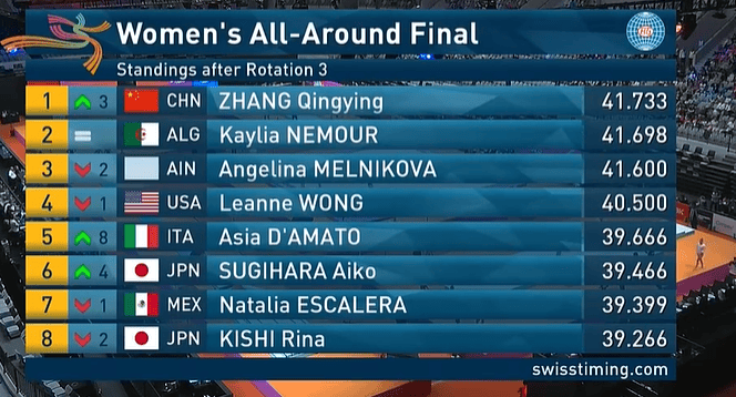 三轮结束,中国张清颖凭借在高低杠的14.833分,总分41.733分,升至第一。