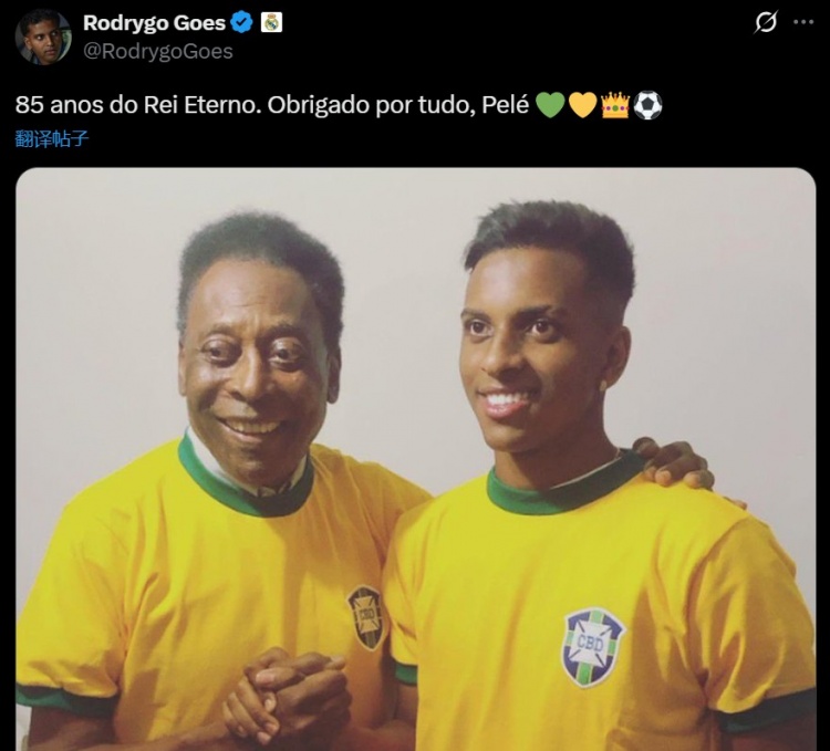 罗德里戈写道:“永恒之王85岁,感谢你所做的一切,贝利。”