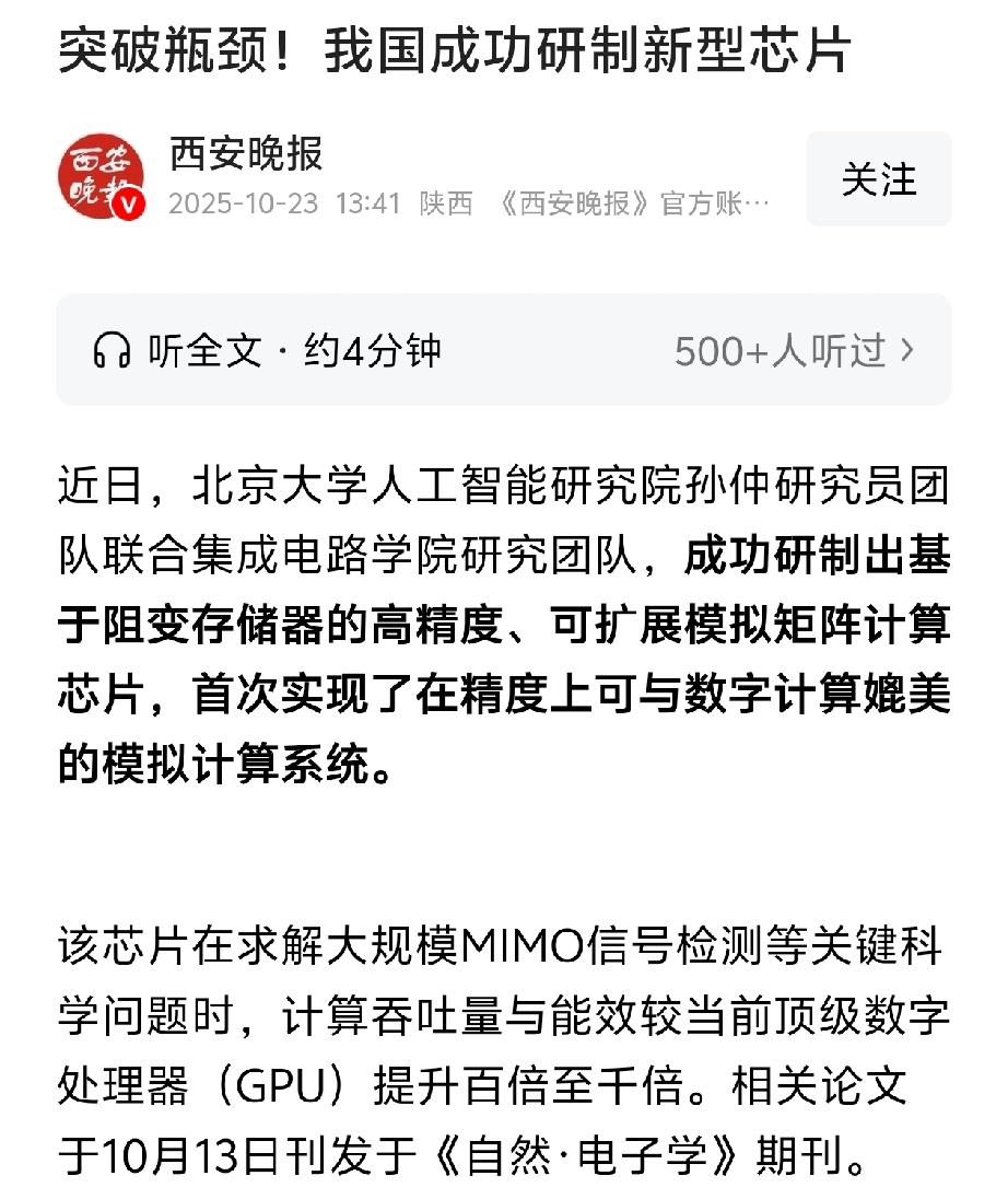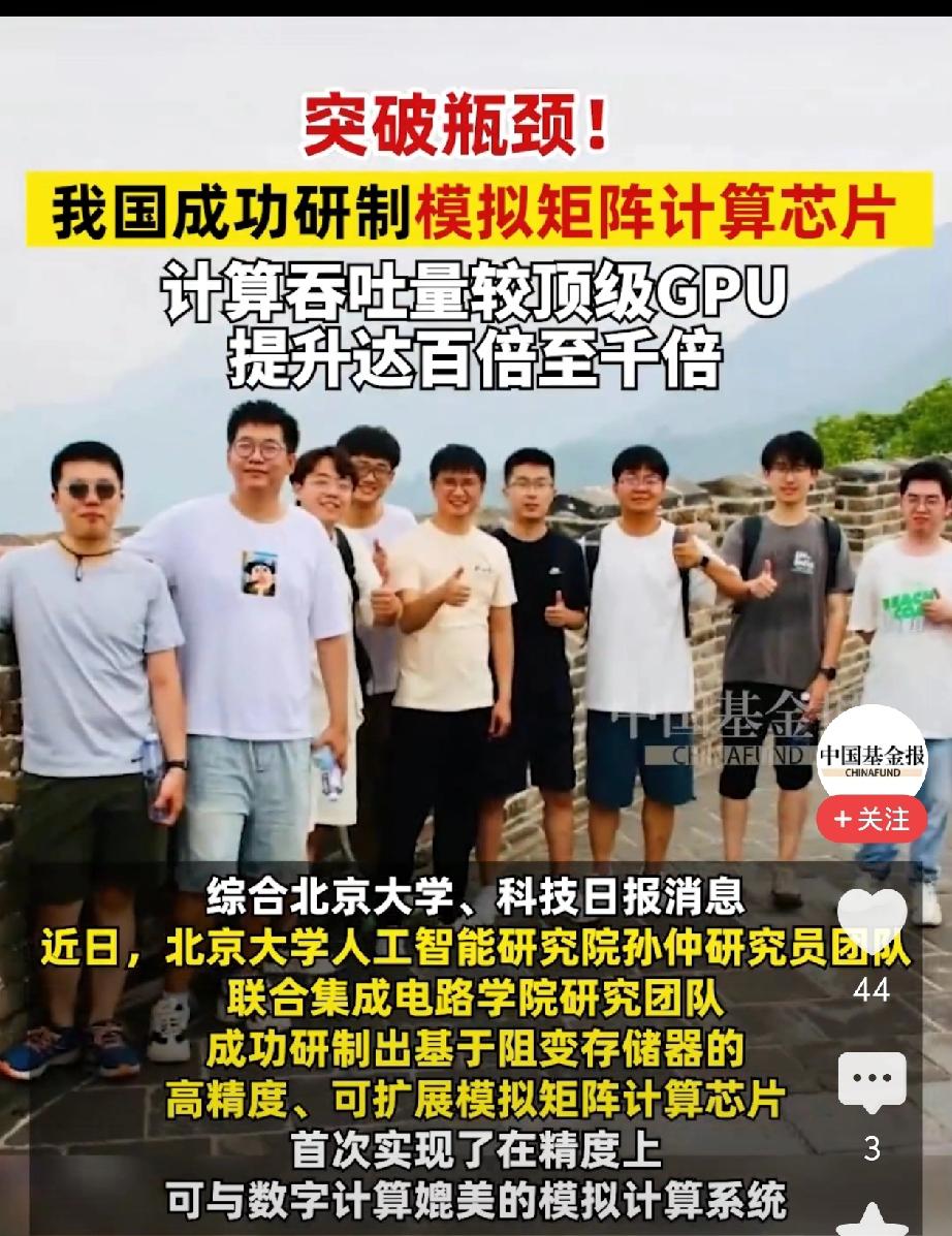 北京大学,惹祸了? 历史性突破瓶颈,成功研制出新型芯片,性能提升达百倍至千倍…… 看了半天,具体看不懂,反正就是突破了。团队来自于北京大学人工智能研究院孙仲研究员团队,你看看是不是都是一帮小伙子,年轻人?北京大学可不缺人才。 现在能够对外宣布,在媒体上公布,就是一种成功和自信。 米帝国主义看了还不又着急了!卡脖子卡了半天,根本卡不住!