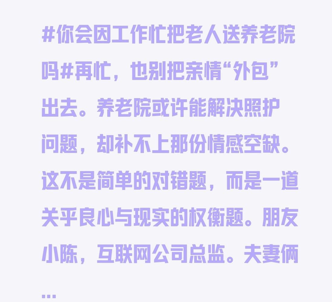 养老院或许能解决照护问题,却补不上那份情感空缺。这不是简单的对错题,而是一道关乎良心与现实的权衡题。 朋友小陈,互联网公司总监。 夫妻俩经常加班,孩子才上小学。 七十多岁的母亲去年中风后,腿脚不便。 请过两个保姆,都不满意。 今年咬牙把母亲送进了高端养老院。 月费一万二,环境像酒店。 每周探望一次,母亲总说“挺好”。 可护工私下说,老人常盯着窗外看。 有次小陈临时过去,看见母亲正小心地把他们带来的水果分给室友——那是她一周里最重要的事。 小陈说,那一刻他眼泪差点下来。 母亲在养老院被照顾得很好,但那种“好”里,缺了家的温度。 现在他尽量周末接母亲回家住,哪怕只是吃顿饭。 “不能让母亲觉得,我们把她存起来了。” 养老院不是洪水猛兽,专业护理确实能减轻负担。 但关键要看老人的意愿和状态。 能自理、喜欢热闹的,或许更适合社区养老或居家陪伴。 真要选择养老院,也别当“甩手掌柜”。 钱到位了,情感更要到位。 别忘了: 我们今天怎么对待父母,明天孩子就怎么对待我们。 这个决定,关乎的不仅是父母的晚年,更是我们自己的心安。 如果是你,会怎么选?欢迎在评论区聊聊你的看法。