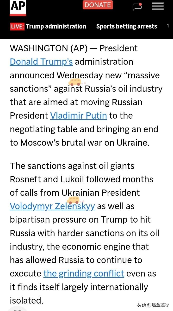 周三,川普宣布对大鹅的两家最大石油公司~俄罗斯石油公司和卢克石油公司实施制裁。👏 至此,俄罗斯排名前四的石油公司都已被美国制裁,此次制裁还会波及多家总部设在俄罗斯,由俄罗斯石油公司和卢克石油公司控股的子公司,这些公司会因此被禁止进行任何美元交易。受此影响,国际原油价格上涨逾4%。 据称,已有多家公司开始大量购买俄罗斯石油。 🤔 那些垃圾新闻媒体为什么没有报道如此重大事件? 谁夹谁得白血病,全家得白血病。 乌克兰 俄乌战争 聚焦俄罗斯乌克兰局势