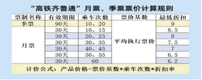 “高铁齐鲁通”月票有效期为30天,根据自身情况选择乘坐10、15、20、25、30、35、40、45、50、55、60次指定发到站间及席别的列车,支持跨月使用。季票有效期长达90天,乘坐10、20次指定发到站间及席别的列车,支持跨季使用。