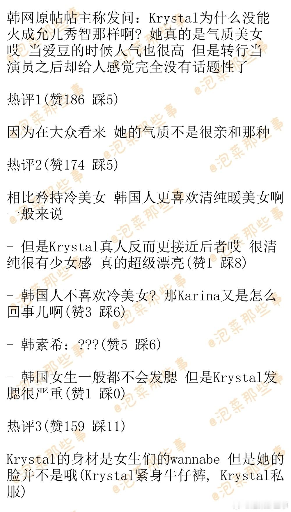 韩网原帖帖主称发问:Krystal为什么没能火成允儿秀智那样啊? ​她真的是气质美女哎 当爱豆的时候人气也很高 但是转行当演员之后却给人感觉完全没有话题性了