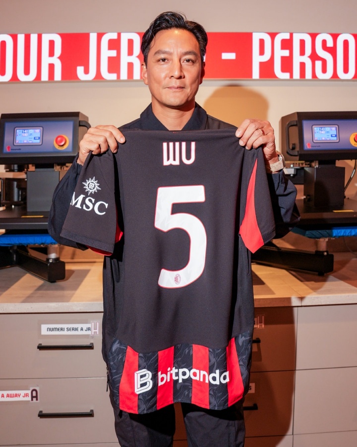 直播吧10月24日讯AC米兰官博更新动态,晒出影星吴彦祖与米兰球衣的合照,球衣印号是5号的“WU”。