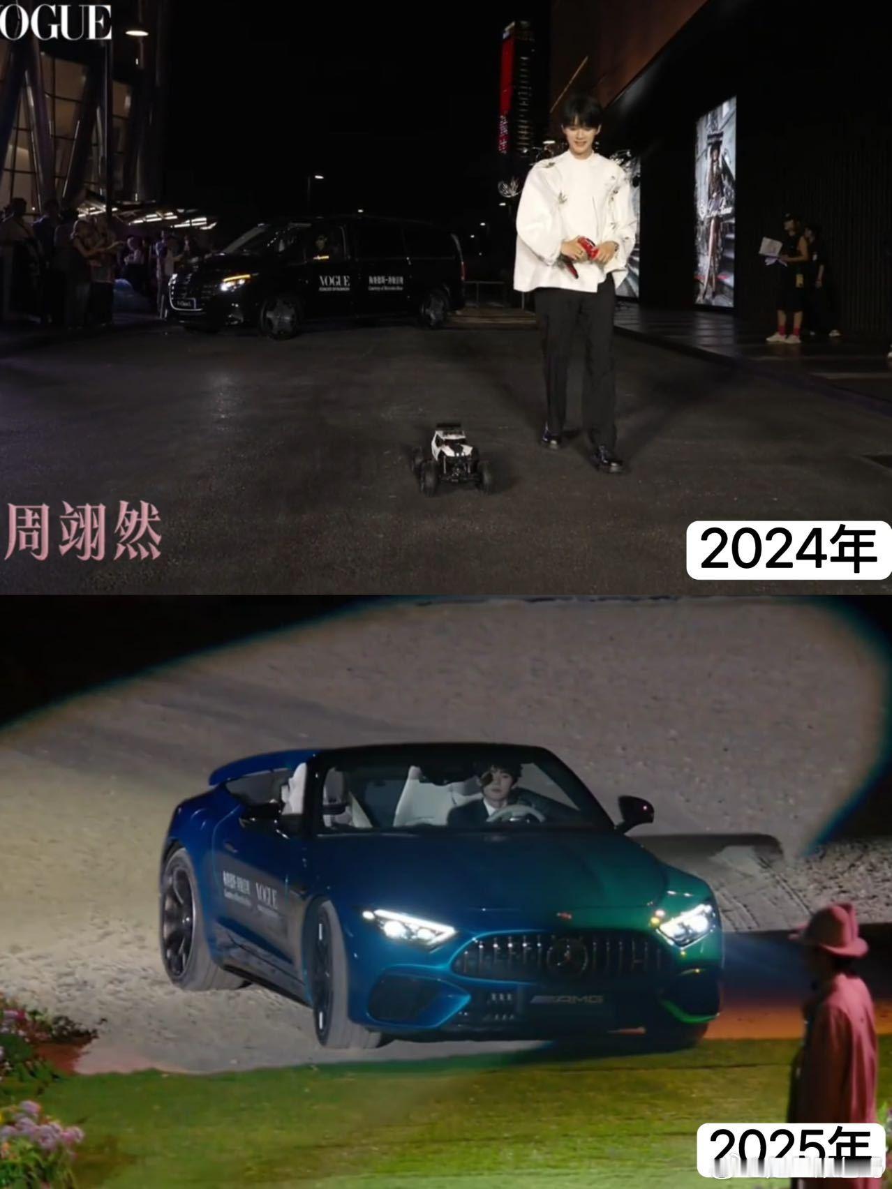 周翊然 遥控车变开真车 连续两年VOGUE盛典玩出花!去年带遥控车藏少年童趣,今年直接开奔驰跑车漂移入场,全黑look帅到失语,从玩具到真车的进阶太绝了!