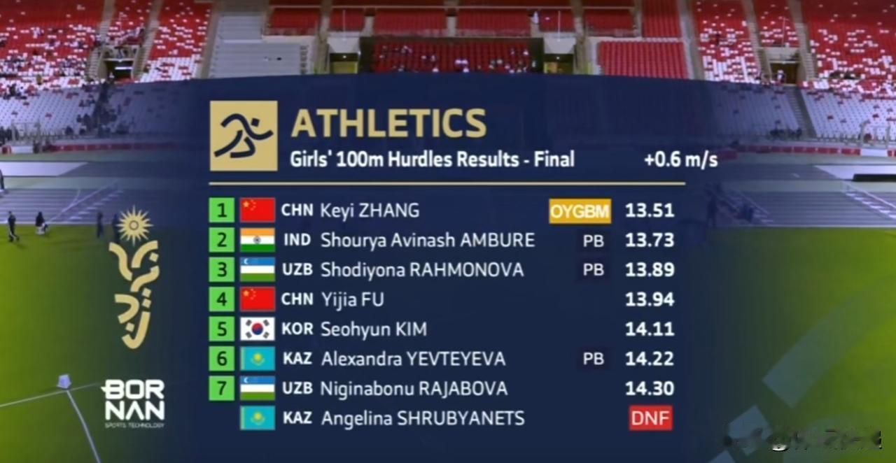 中国选手张可依夺得亚青赛女子100米栏冠军。符艺嘉夺得第四名。