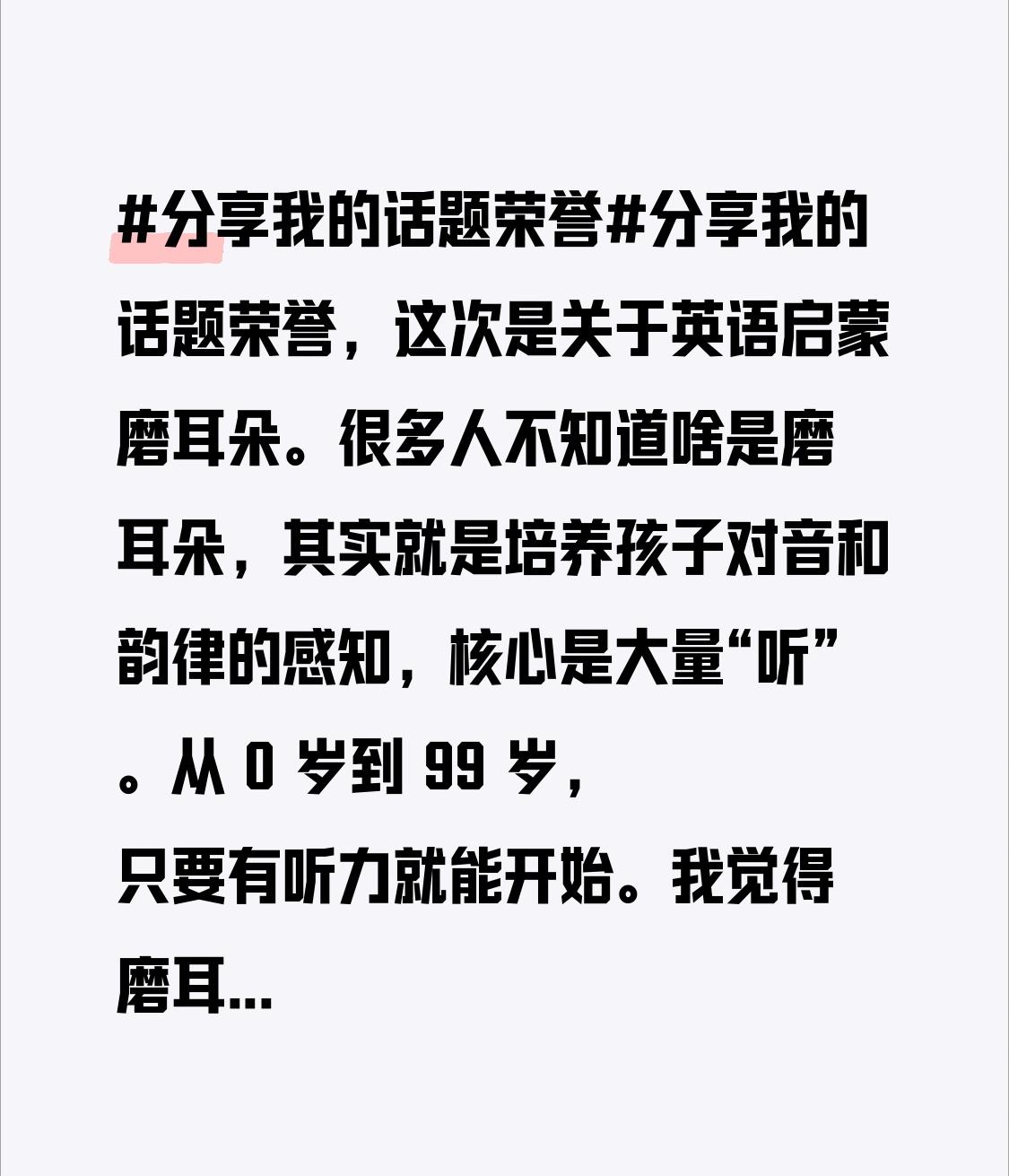 很多人不知道啥是磨耳朵,其实就是培养孩子对音和韵律的感知,核心是大量“听”。从 0 岁到 99 岁,只要有听力就能开始。 我觉得磨耳朵要先帮孩子建立音、形、义关联,理解内容后再熏听。材料可以选绘本、分级读物、动画电影、儿歌,像 Yakka Dee、《小猪佩奇》就很不错。 每天至少听半小时,磨耳朵阶段得保证 2000 小时的听力输入。按照这些方法,孩子英语启蒙会顺利很多,我家孩子就从中受益啦。 磨耳朵英文启蒙 英语磨耳朵训练 磨耳朵启蒙英语 儿童磨耳朵英语 早教磨耳朵 英文磨耳朵