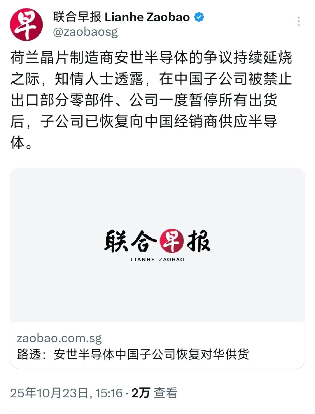 来自外媒10月23日的消息说,关于安世半导体的争议还在继续。 消息强调,此前中国的子公司被禁止出口部分零部件,但是现在子公司已经恢复向中国的经销商供应半导体。 事实上,这样的结局说明,荷兰在这场闹剧之中,最终肯定要选择低头。因为我们的反制让荷兰觉得自己的做法要付出巨大代价。荷兰方面还非常委屈的说,我们的反制让他们感受到了巨大的压力,他们事先没有想到会是这样的结局。他们一直觉得自己对这些技术的管控,是为了确保在技术方面的领先,而不是为了和美国一起遏制中国。 但是任何这样的解释都是苍白无力的,我们是不可能相信的。 所以这一次,情况发生变化,荷兰也是主动跟我们进行了沟通。这一次的事件也可以给其他国家提个醒,不要贸然的跟着别人去遏制中国,这样是要付出代价的。