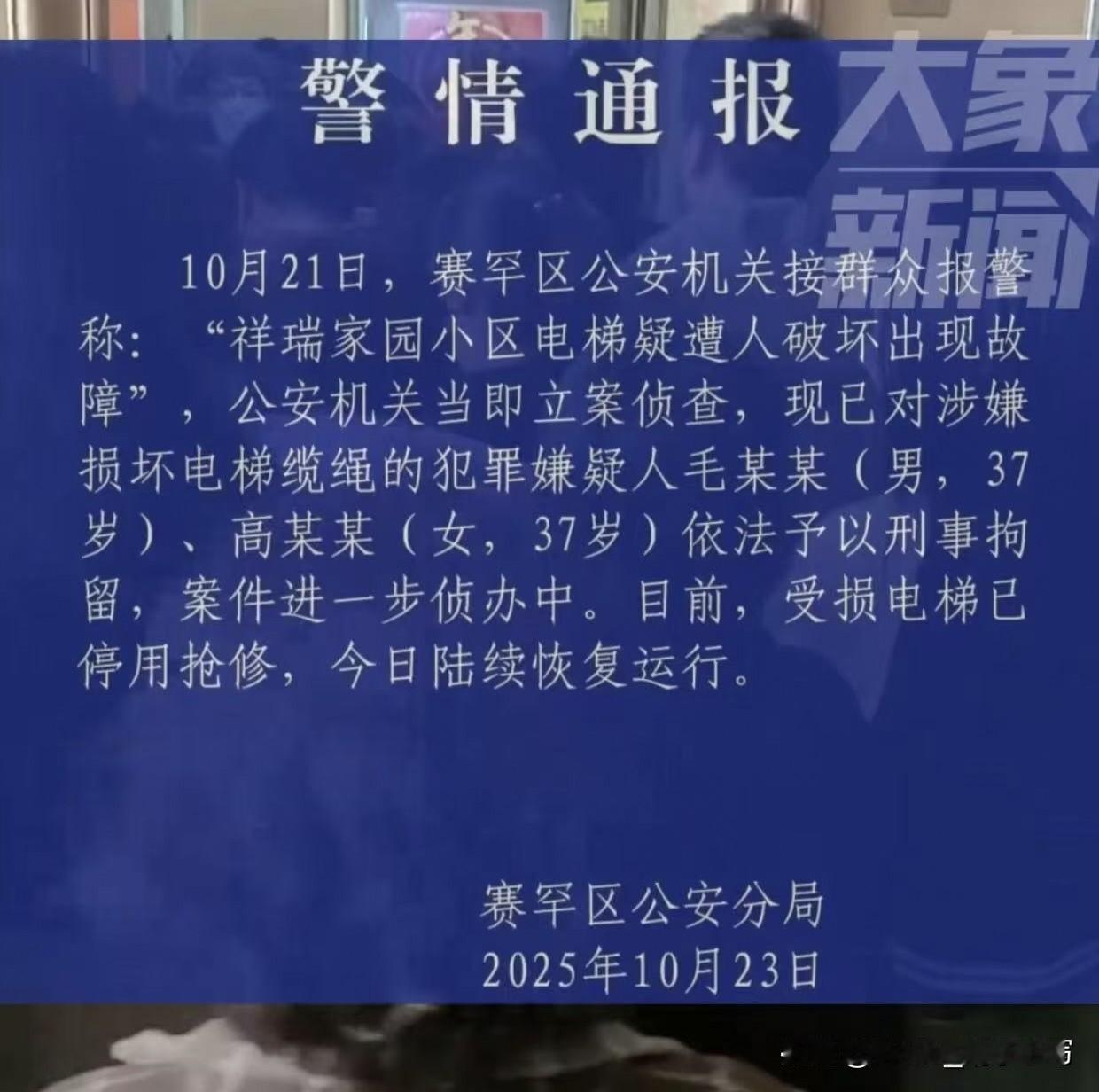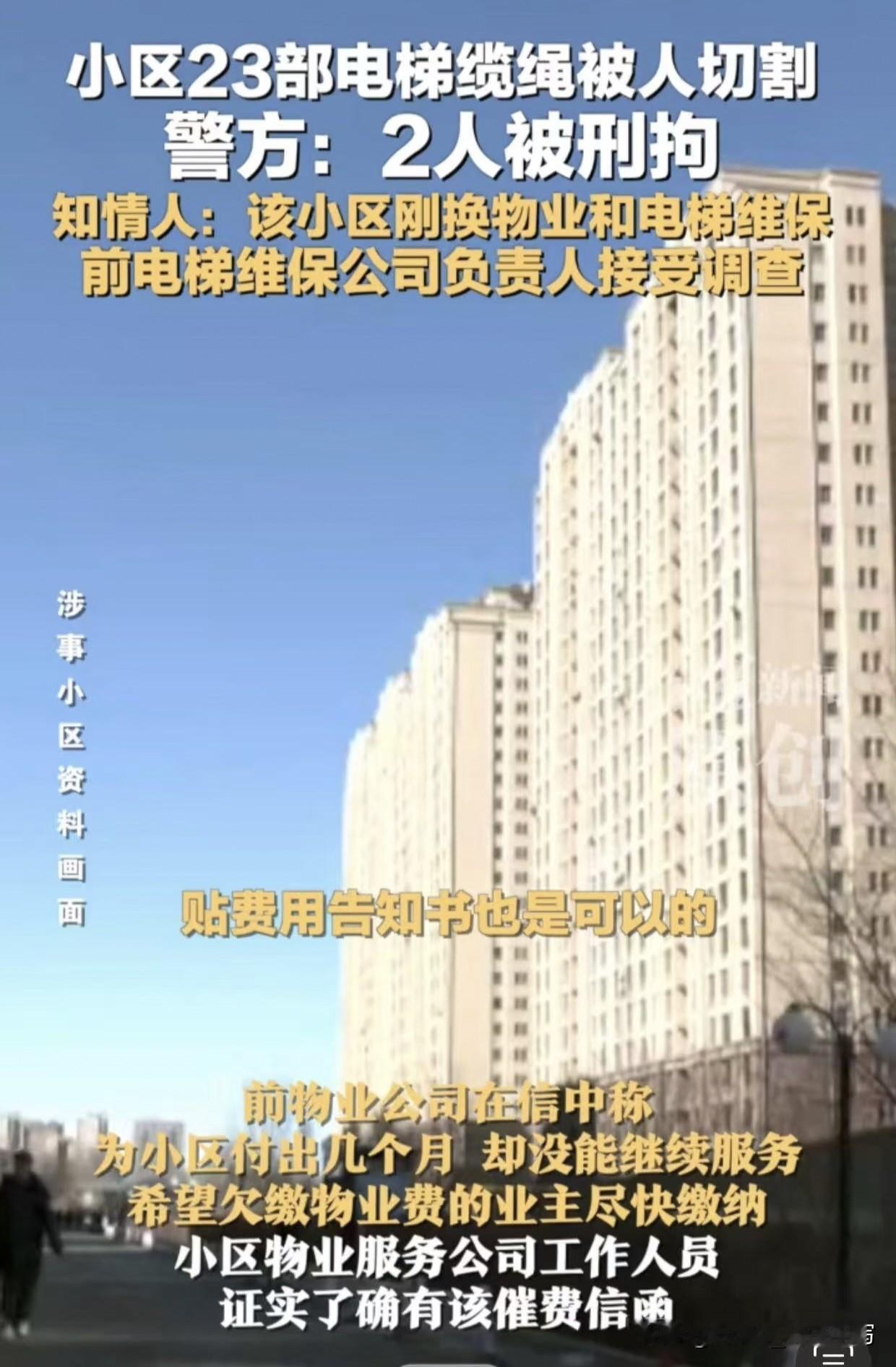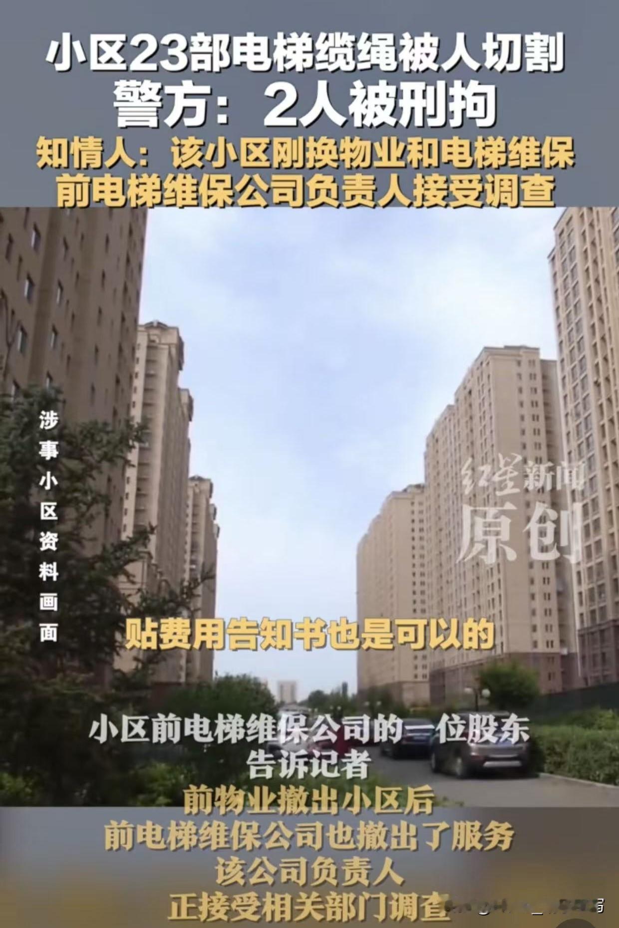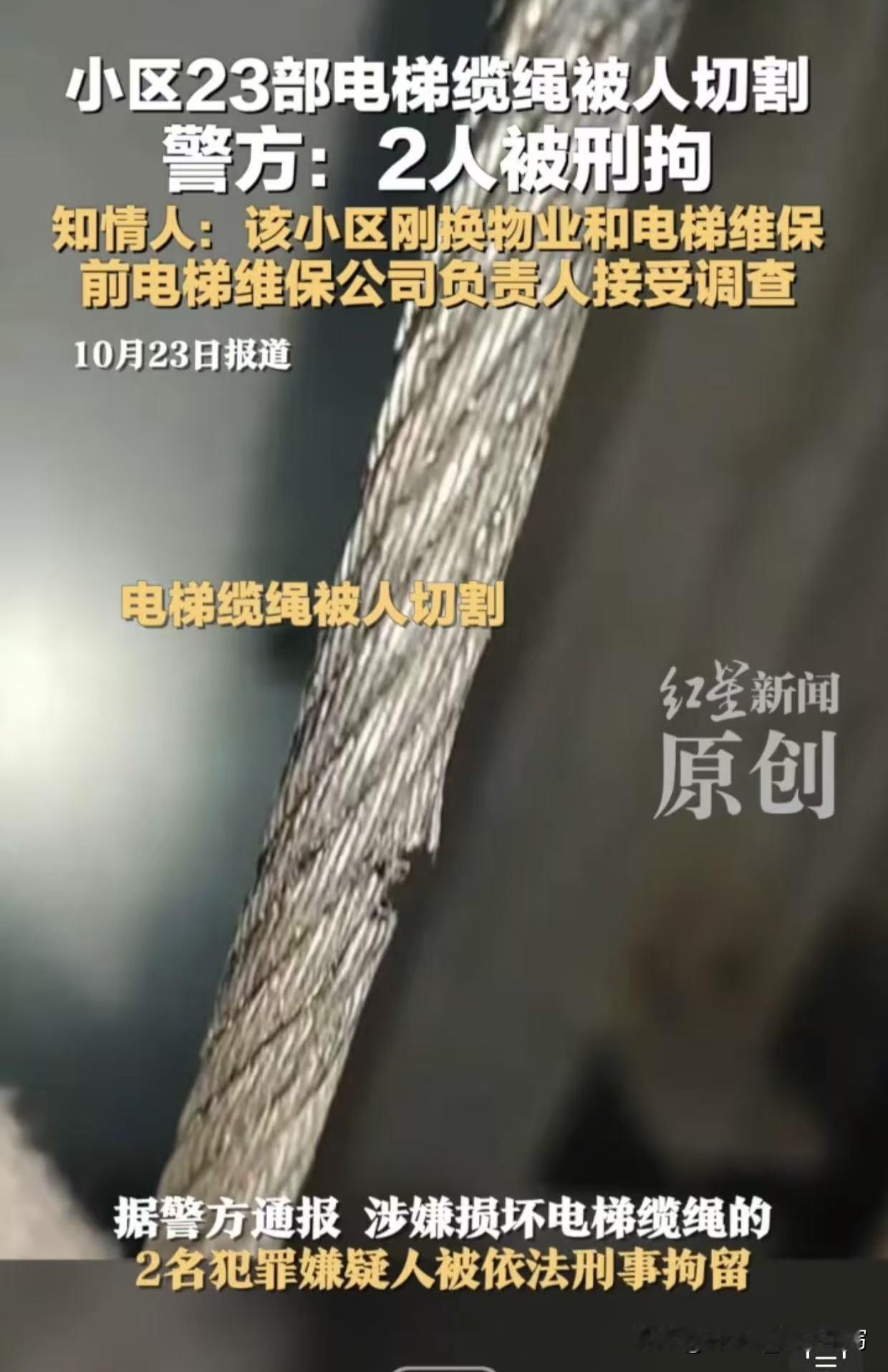 家人们,吓出一身冷汗! 呼和浩特一小区23部电梯的承重钢丝,被人拿工具割了! 不是老化,不是意外,是人为!而且割得特别阴险,只切三分之一,随时可能断裂! 要是电梯从20多层掉下来,里面坐着老人孩子的话,后果不堪设想。 更气人的是,查出来俩人,不是业主,疑似前物业的! 懂技术、有钥匙,精准下手,明显是冲着换物业闹矛盾来的报复! 拿全楼几千人的命泄愤,还有人性吗? 这哪是破坏公物?这是谋杀未遂! 物业交接谈不拢可以打官司,谁给他们的胆子拿人命开玩笑?! 这事必须严查重判! 也提醒所有人,别忽视身边的“隐形危险”。 对此你怎么看?