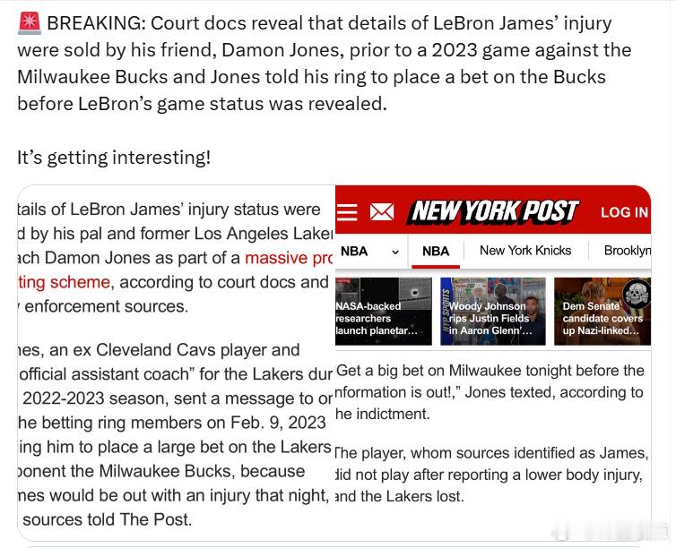 法庭文件显示,在2023年勒布朗·詹姆斯对阵密尔沃基雄鹿的比赛前,他的朋友达蒙·琼斯泄露了詹姆斯的伤情细节,并告诉他的朋友圈在詹姆斯比赛状态公布前押注雄鹿队。