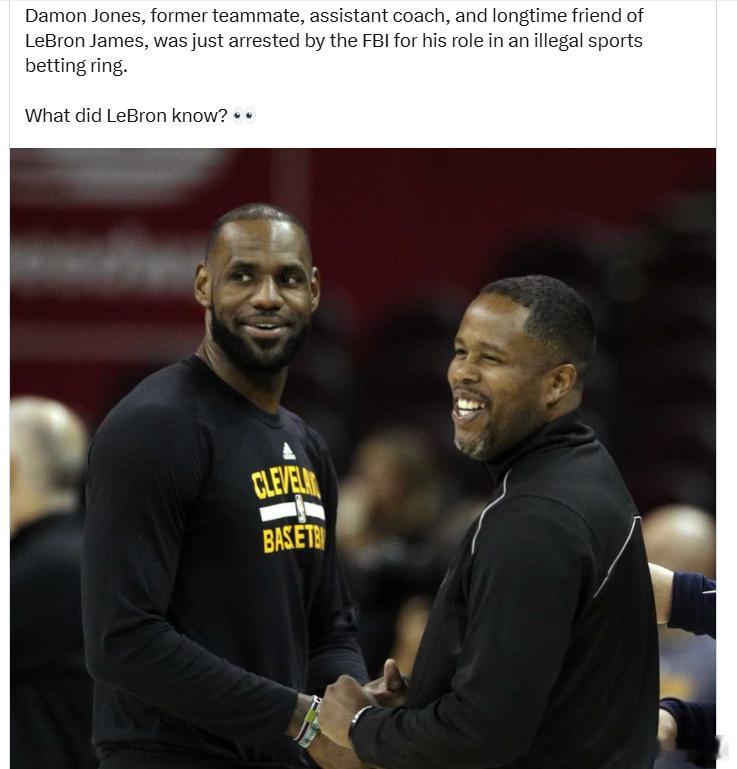 勒布朗·詹姆斯的前队友、助理教练以及长期好友达蒙·琼斯因参与非法体育博彩团伙,刚刚被联邦调查局逮捕。