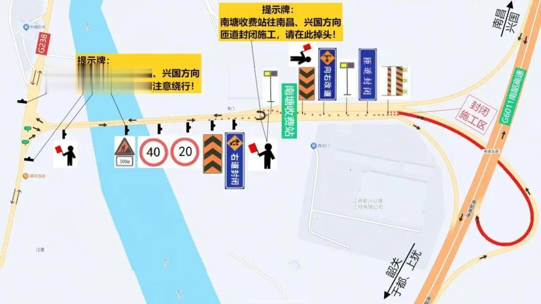 2025年10月28日06时至18时,同时封闭南塘收费站往南昌、兴国方向以及韶关、于都、上犹往南塘收费站方向匝道。