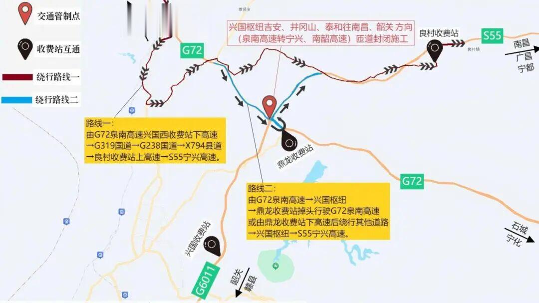 管制范围:封闭兴国枢纽吉安、井冈山、泰和往南昌、韶关方向(泉南高速转宁兴、南韶高速)匝道,过往司乘人员需提前做好绕行准备。