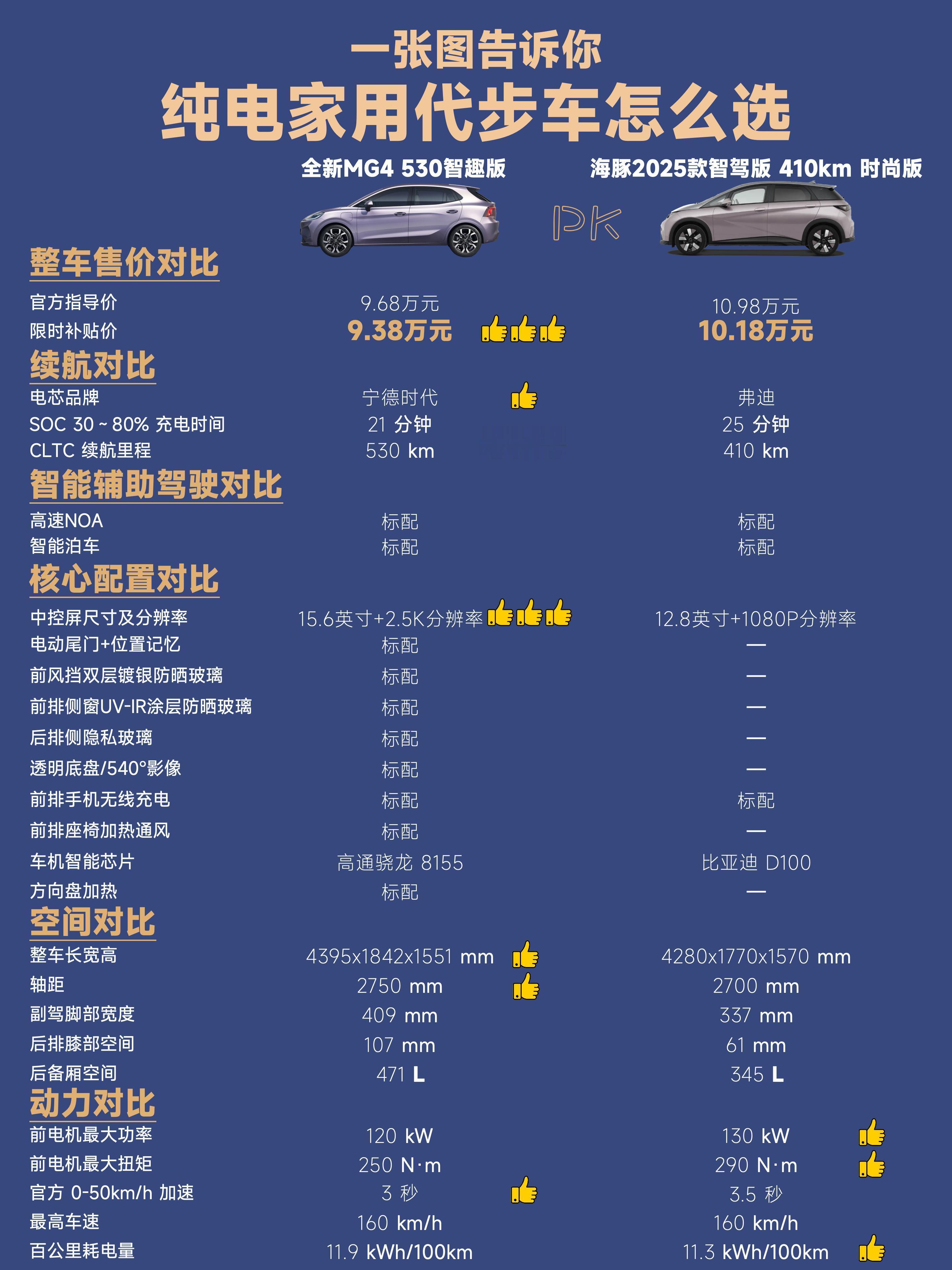 给大家总结一下选购建议:如果你的预算在10万左右,追求高性价比智能配置,经常跑高速需要驾驶辅助功能,或者对空间实用性、动力续航有较高要求,那全新MG4智趣版530绝对是首选,9万级能买到这样的配置真的诚意满满。如果更看重品牌生态适配,日常主要是城市短途代步,对智能和空间需求不高,也可以考虑比亚迪海豚,但综合实力来看,MG4智趣版的优势确实更明显。