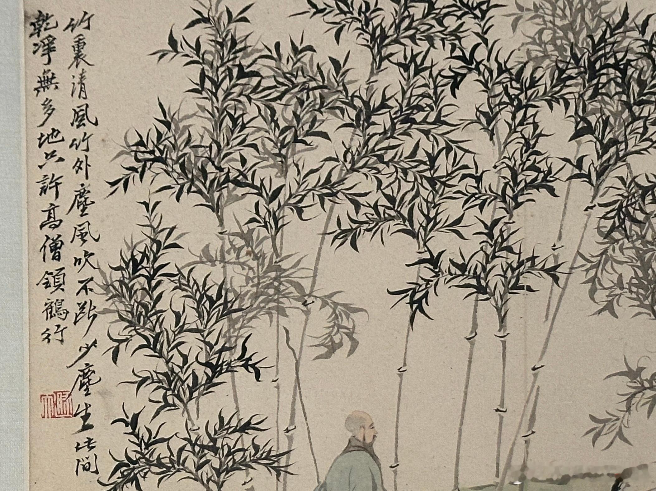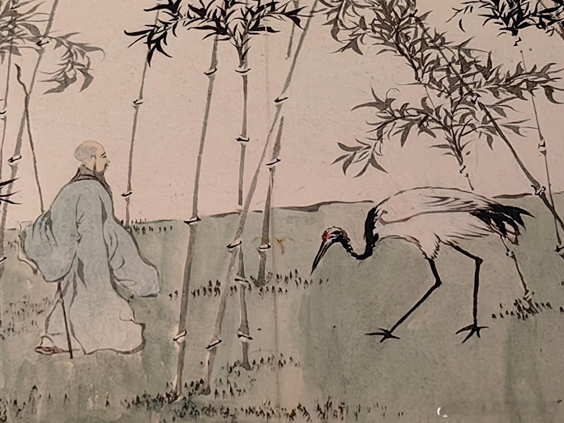 此两帧为“罗两峰写意人物十二帧”第八、第十二帧,纸本。其一画作在画幅左侧有罗聘自题:“竹里清风竹外尘,风吹不断少尘生。此间干净无多地,只许高僧领鹤行。”只见画中僧人执杖曳履,其后有胎仙相随,一僧一鹤曳步竹林,一派超脱尘世的境界。其二幅画作在画幅右侧有罗聘自题:“野梅瘦得影如无,多谢山僧分一株。此刻闭门忙不了,酸香嚥罢数花颚。”诗人在古寺流连,寺梅婆娑清癯,花影若有若无,山僧见状便折赠一枝以慰诗兴。