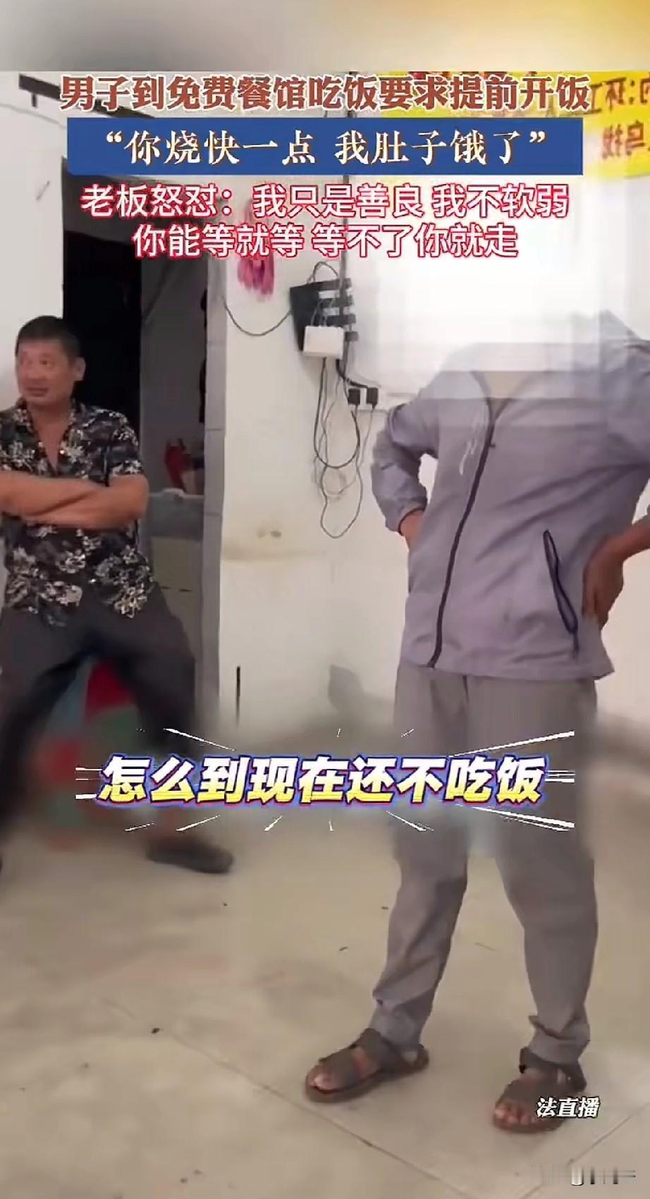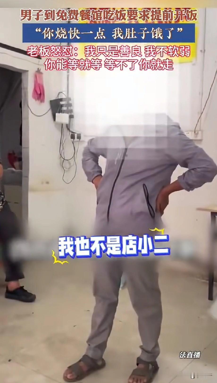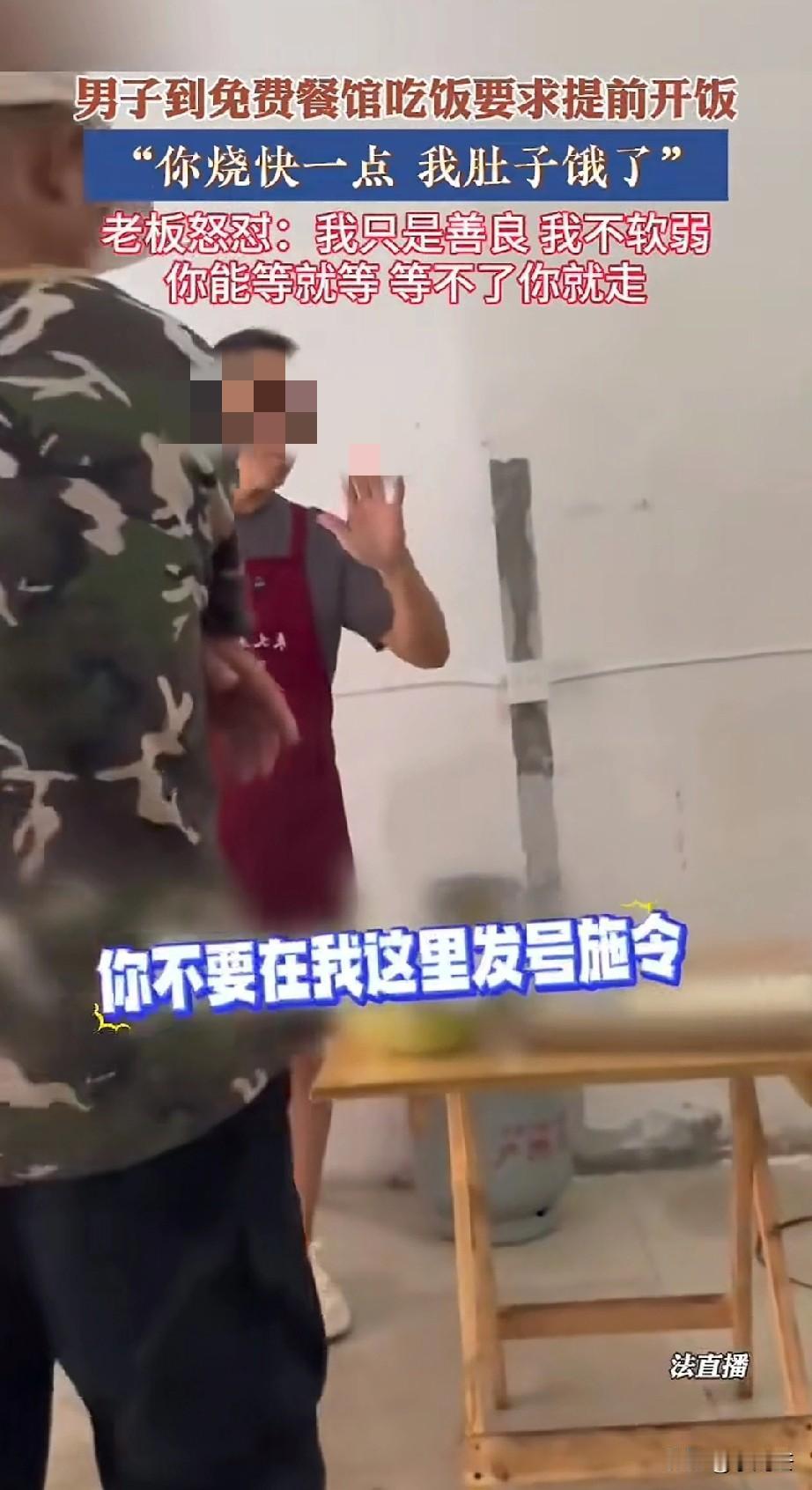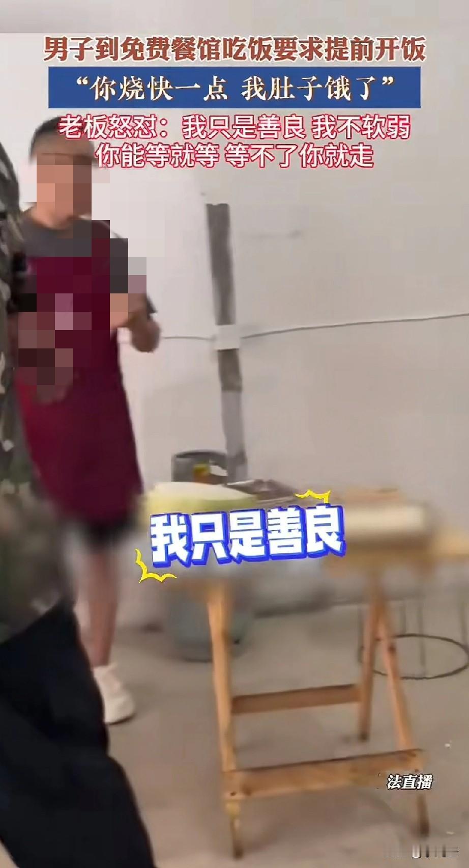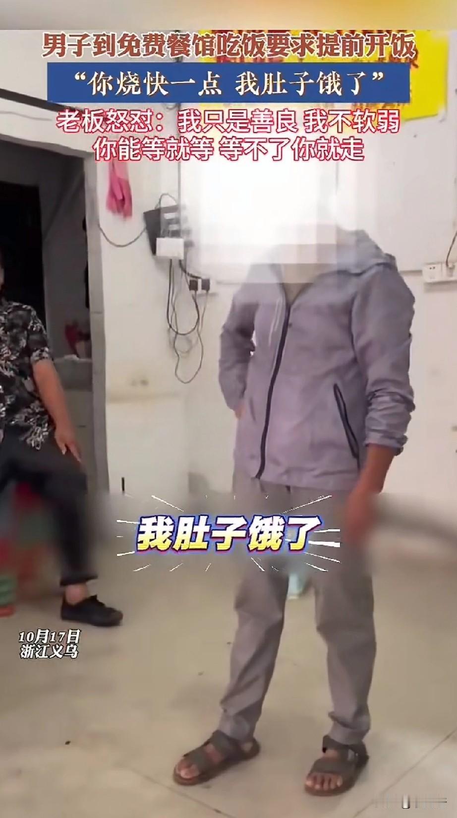 “升米恩,斗米仇!”一位在义乌开饭店的杨先生,为了做公益,特地在店门上写着为环卫、快递和生活困难的人免费提供面条和盒饭。自开业以来,生意火爆,很多环卫工和快递小哥来吃饭,不料一位小哥公然来店里咆哮,“烧饭烧快一点,我肚子都饿了,说10点就开饭,现在还不吃饭?”老板生气怒怼,“我只是善良,但不软弱,你不要对我发号施令!” 视频中很多人都在场,没有一个人催促老板,大家都在很耐心的等着老板做饭。只有这个小伙子,双手叉腰,催他快点做饭。 一开始小伙还想问要袋子,装着饭,店主没给。店主说,虽然袋子可能也就2毛钱,吃饭可能得5块钱,但是你吃饭可以,袋子我不提供,我只能管你吃饭! 然后小伙很生气,就又催做饭快点,他很饿。忍无可忍的老板站出来怒怼,我做公益是我善良,并不是软弱,你不是大爷,我也不是店小二! 本是造福社会的大善事,偏偏就有人不讲良心,就如人所说,善良应该带着锋芒! 不然就会有人得寸进尺,毫无感激之心,一开始得到免费的好吃,会心存感恩,内心谦卑。时间一长,就变成理所应当的索取! 人心易冷,回暖太冷,莫让好心人心寒!