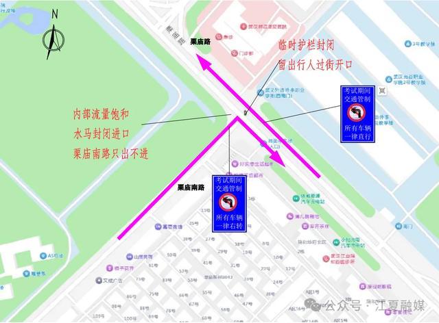 1.栗庙路与栗庙南路路口(沿线涉及武汉纺织大学外经贸学院、武汉外语外事职业学院、武汉光谷职业学院考点):早7:00—9:00栗庙南路路口临时交通管制,栗庙南路(武汉纺织大学外经贸学院—栗庙路)仅允许由南向北单向通行,考生步行进入考场;