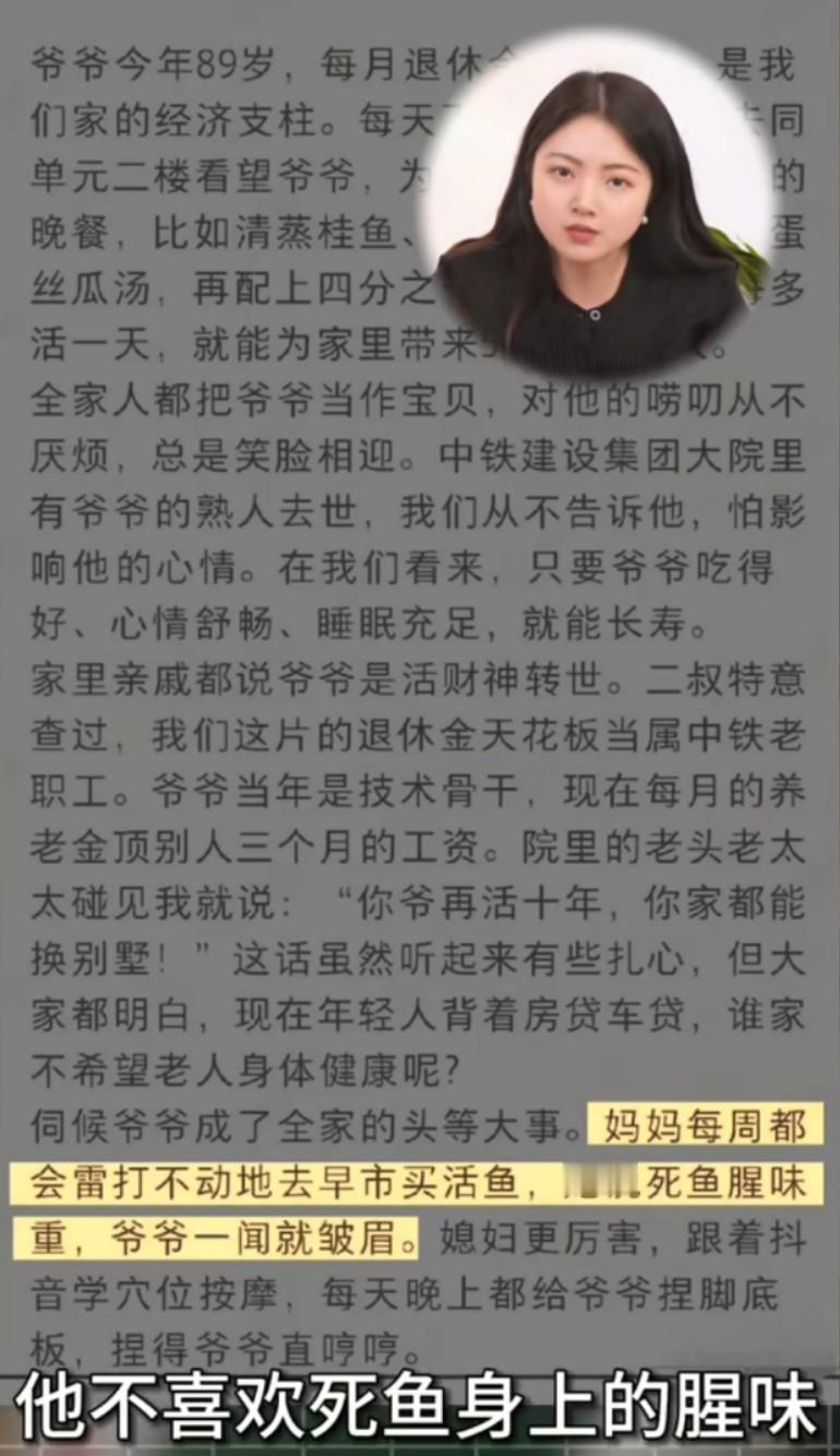 爷爷每多活一天就能为家里带来“566元”的收入,全家围绕着爷爷转,这孝顺是有前提的 那就是爷爷有17000的退休金。我们这也有一个是这样的。孙子直接辞职了,一个月就5000多,他父母也退休了,年级大了直接辞职照顾一个月1.6个。确实是这样,有个叔公就是这样,医生已经说没得救了,家人硬是要医院拖着他的命,因为人家是抗战老兵,住院基本上都报销。最终在医院住了半年多后走了。 还见过直接在ICU用呼吸机维持生命的。退休老干部。住院全部报销,1分钱都不用花,每月上万退休金。