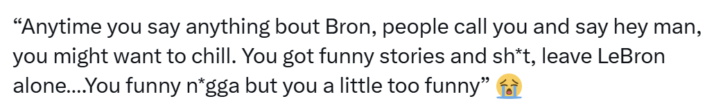 每次你一开口谈论勒布朗,就会有人打电话跟你说:“嘿,兄弟,最好收敛点。你那些搞笑八卦什么的...别碰勒布朗行不行?你这人是有意思,但有点过头了。”