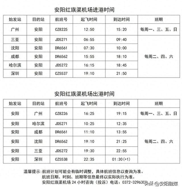 安阳红旗渠机场公布冬春航季航班换季时刻表