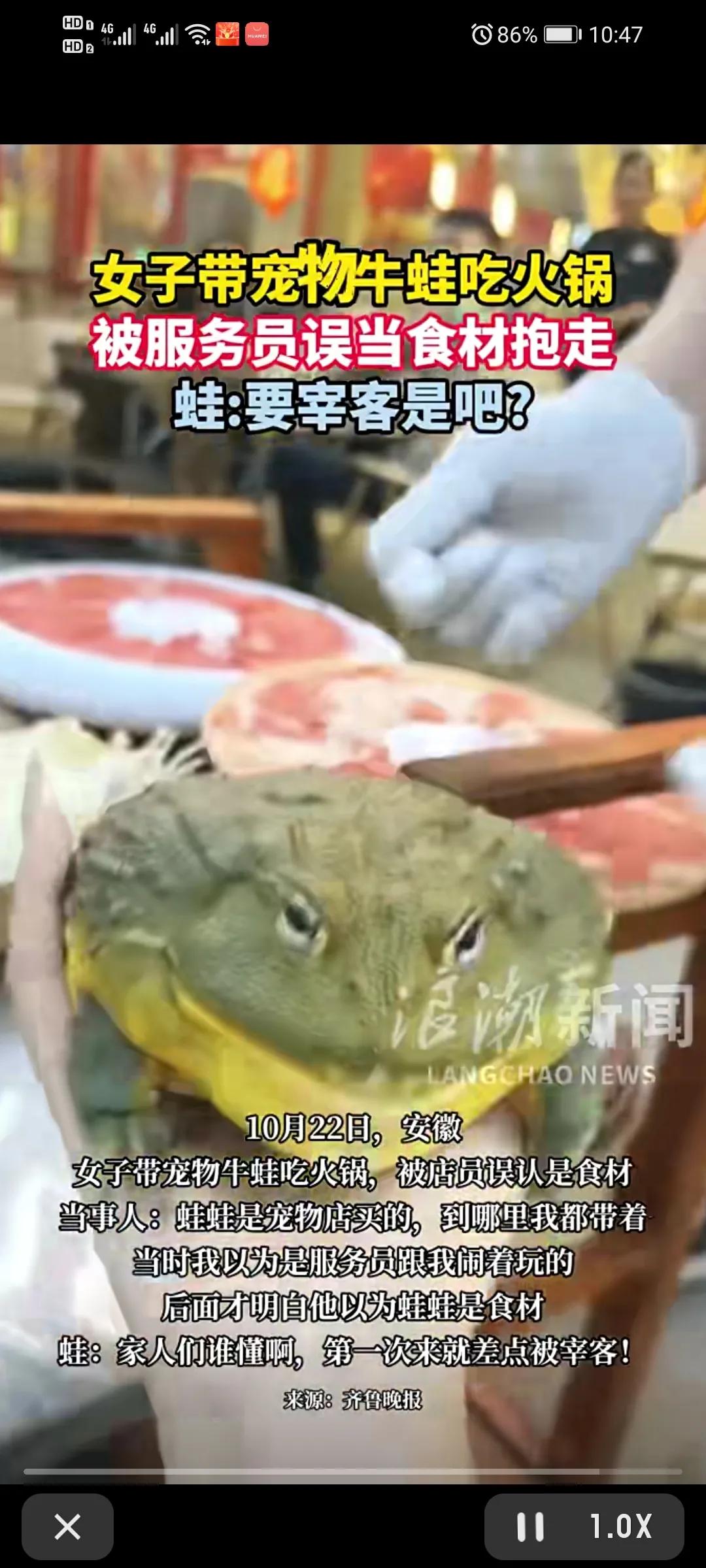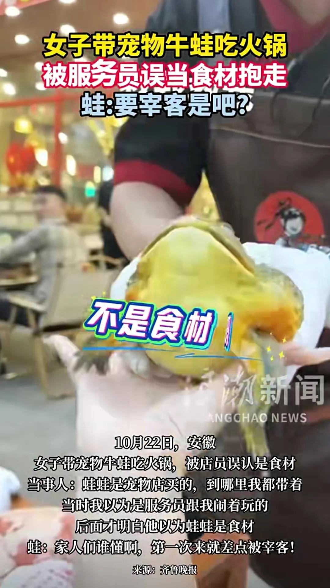今天要给大家讲一个超有趣的新闻。近日在安徽,发生了一件让人哭笑不得的事儿。一位女子带着自己养了很久、性格温顺的宠物蛙去吃火锅,她把宠物蛙放在桌上,结果店员在忙乱中,竟把这只宠物蛙当成了店里准备下锅的食材,伸手就抱起来要往厨房送。还好女子及时惊愕呼喊,店员才发现闹了乌龙。 火锅店知道后,马上向女子道歉,还提出免单或送菜品补偿。女子接受了道歉,也提醒其他养宠人带宠物出门要注意。 这事儿传到网上,网友们炸开了锅。有人调侃蛙蛙是来吃饭不是来被吃的,也有人笑说店员太“敬业”。当然,也有网友理解店员,毕竟宠物蛙和食材长得像。 在我看来,这事儿看似好笑,实则反映出一些问题。养宠人带宠物出门,确实该考虑周全,别给他人和自己找麻烦。而商家呢,加强员工培训、提升管理水平是必须的,不然类似的尴尬事儿恐怕还会发生,到时候影响的可就不仅仅是一次顾客的就餐体验,而是店铺的口碑和生意了。希望大家都能从这事儿里吸取点教训呀。