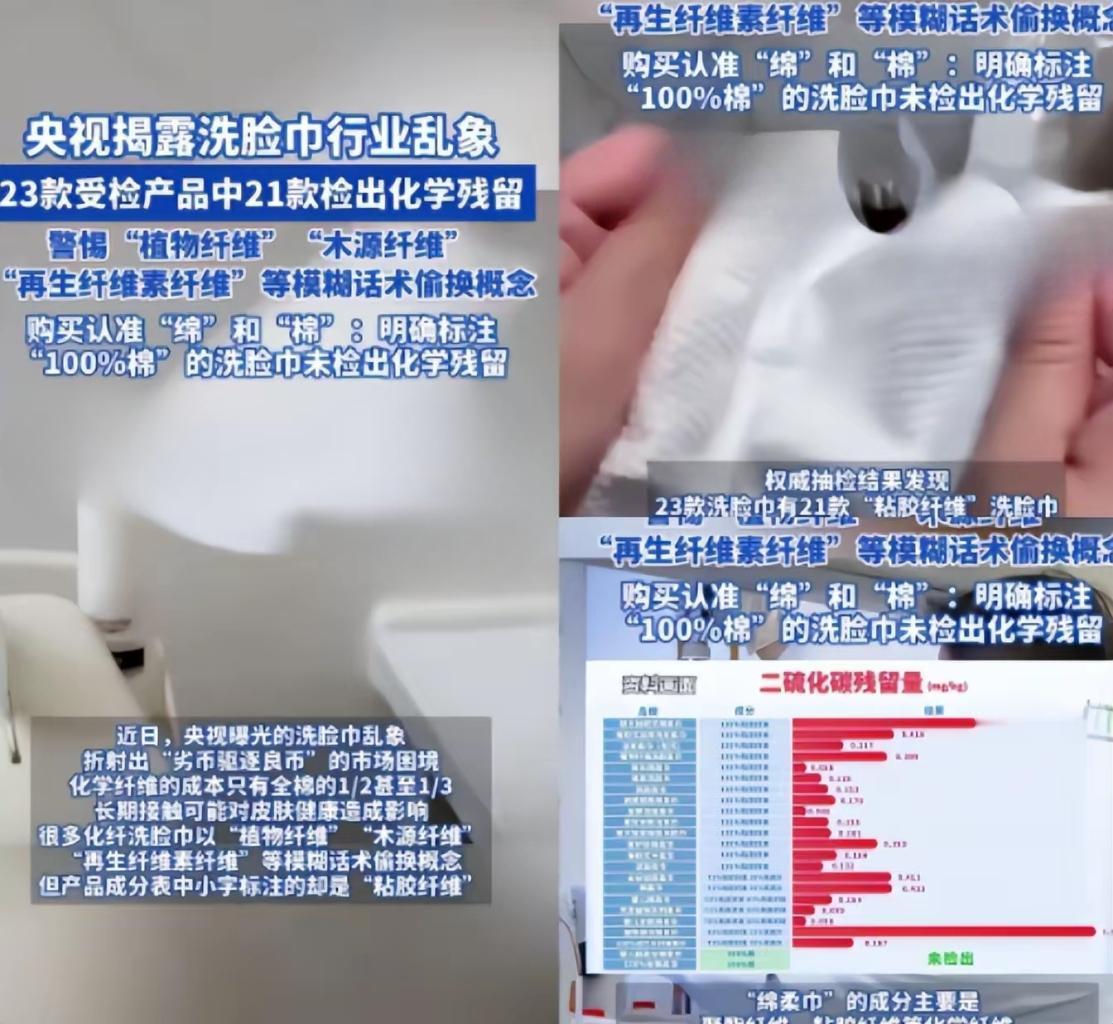 洗脸巾近90%藏“神经毒素”?央视曝光后我赶紧扔了囤货 央视最近曝了个大消息,抽检23款热销洗脸巾,21款都有问题,近90%的“踩坑率”。这东西现在谁家没有?人均一天用5次,擦脸、卸妆、给娃擦手都靠它,线上销量短期还涨了436%,没想到天天贴脸的竟是“隐形炸弹”。有问题的多是粘胶纤维做的,含“神经毒素”二硫化碳,长期用伤肝肾还毁皮肤。 商家玩的“文字游戏”,比毒素本身更恶心。 他们把“粘胶纤维”换成“植物纤维”“再生纤维素”,听着像从树上摘的一样天然;还把“绵柔巾”和“棉柔巾”搞混,差一个字,一个可能全是化纤,一个才是棉花做的。这不是欺负大家不细看吗?之前2023年就有类似抽检,当时也有18款洗脸巾不合格,现在又来一次,说明有些厂家根本没长记性,就盯着“低成本高利润”的路子走。 说到这个,这事儿过后,肯定会有一波“全棉洗脸巾”涨价。 现在大家知道粘胶纤维不安全,都会抢着买纯棉花的,供需一失衡,商家就有理由抬价了。而且那些之前玩套路的品牌,可能会换个包装,印上“央视合格款”之类的字样,继续收割消费者。毕竟洗脸巾是刚需,大家不能不用,只能被迫接受涨价,这就是商家的“趁火打劫”套路。 这事儿也给大家提了个醒,别光看网红推荐就乱买。你家里现在用的洗脸巾,是“棉柔巾”还是“绵柔巾”?不妨拿出来看看,评论区说说你踩没踩过坑?洗脸巾检测 百分棉洗脸巾