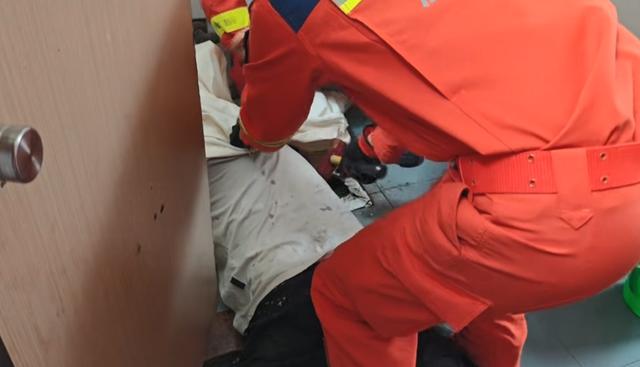 江西九江,一女子不慎将金项链掉入家中的蹲式便池下水管道,丈夫俯下身子想用手捞,结果手臂被卡便池口。消防员赶赴现场后小心破拆,被困三小时的男子终于得以“解脱”。