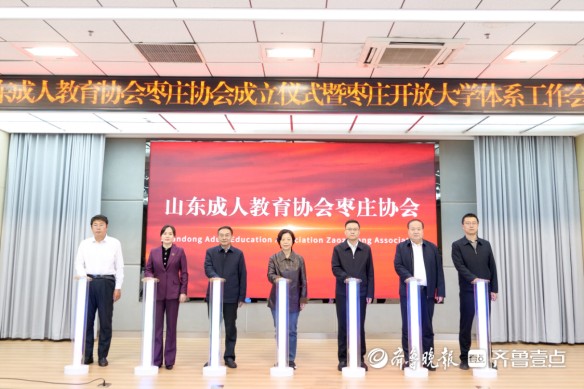 仪式上,与会领导共同按下启动柱,标志着山东成人教育协会枣庄协会正式成立。