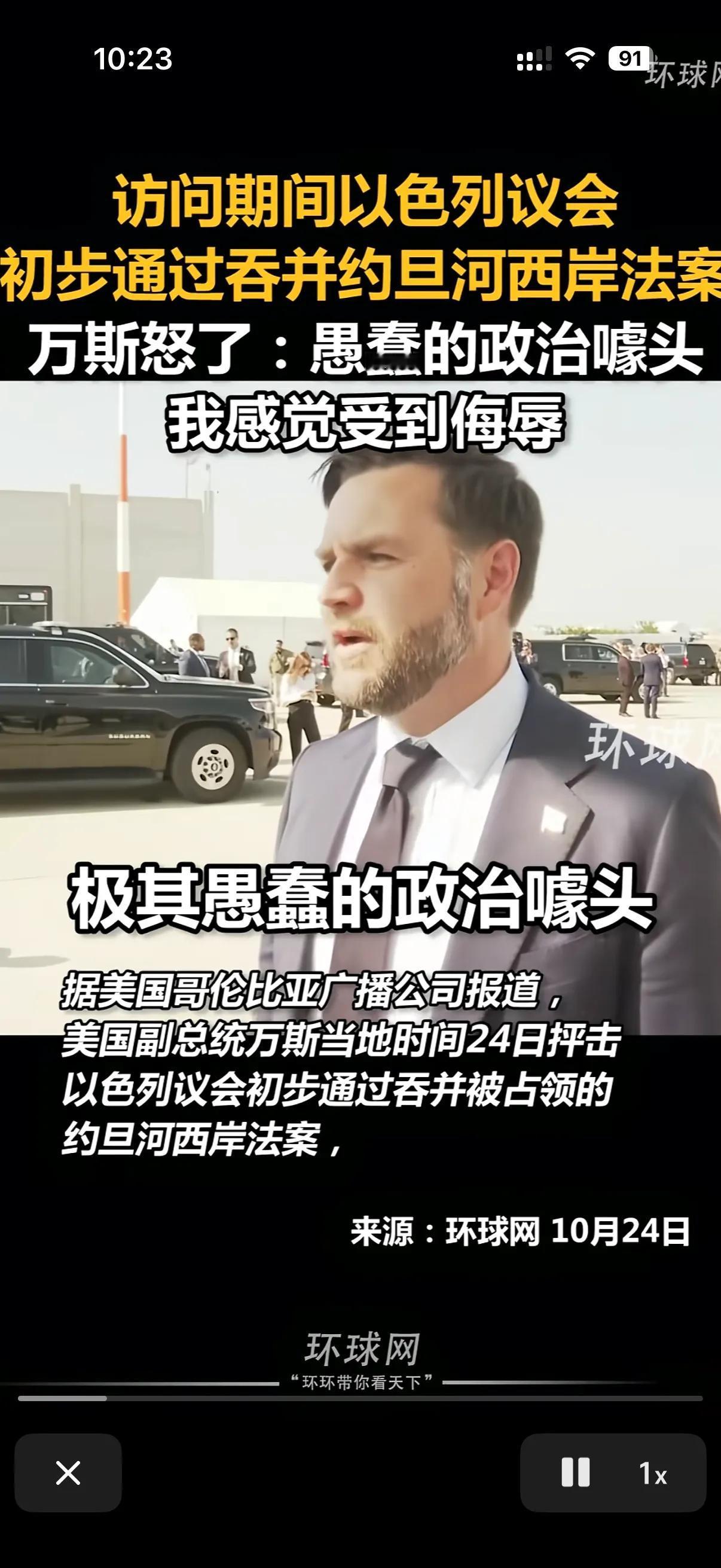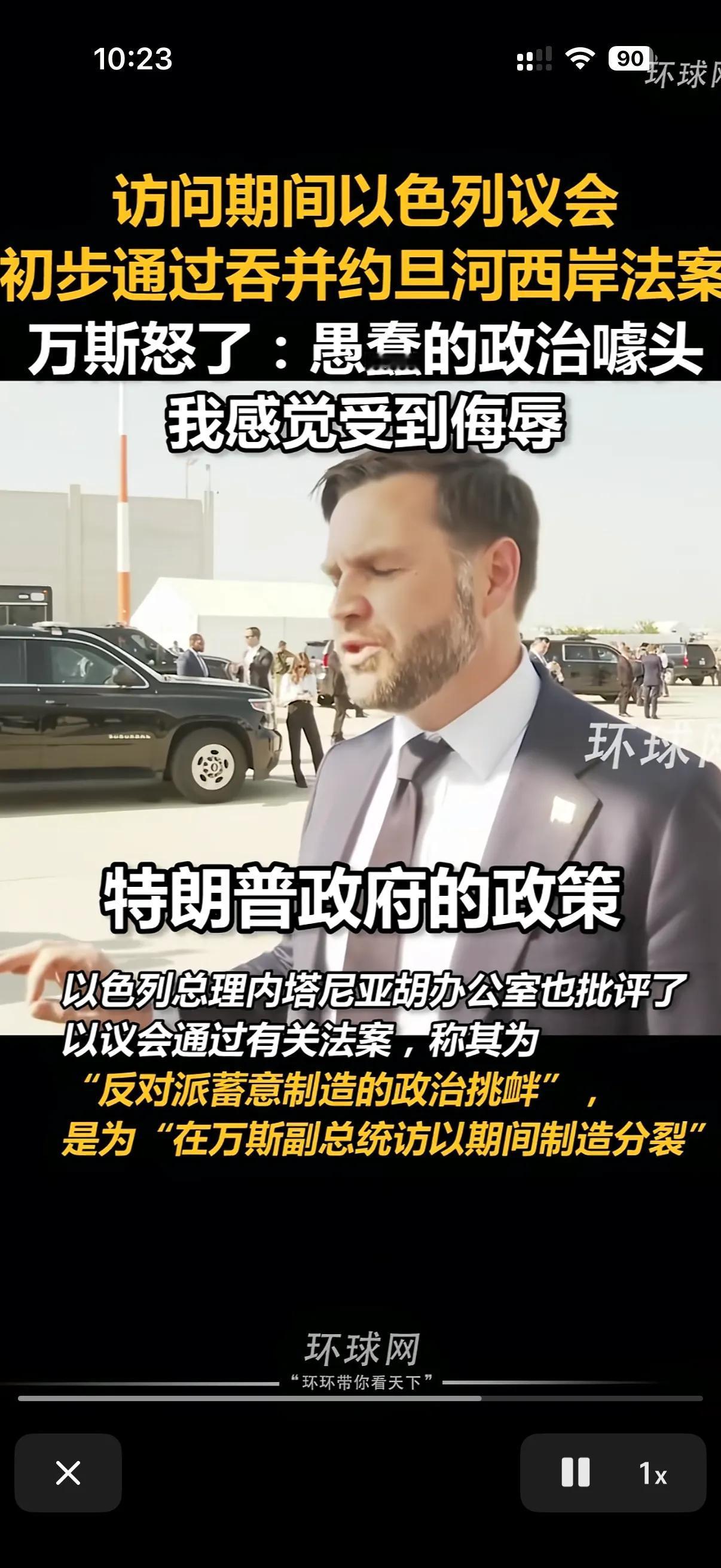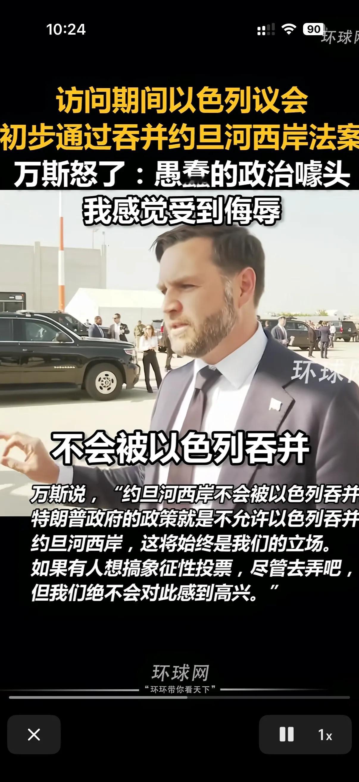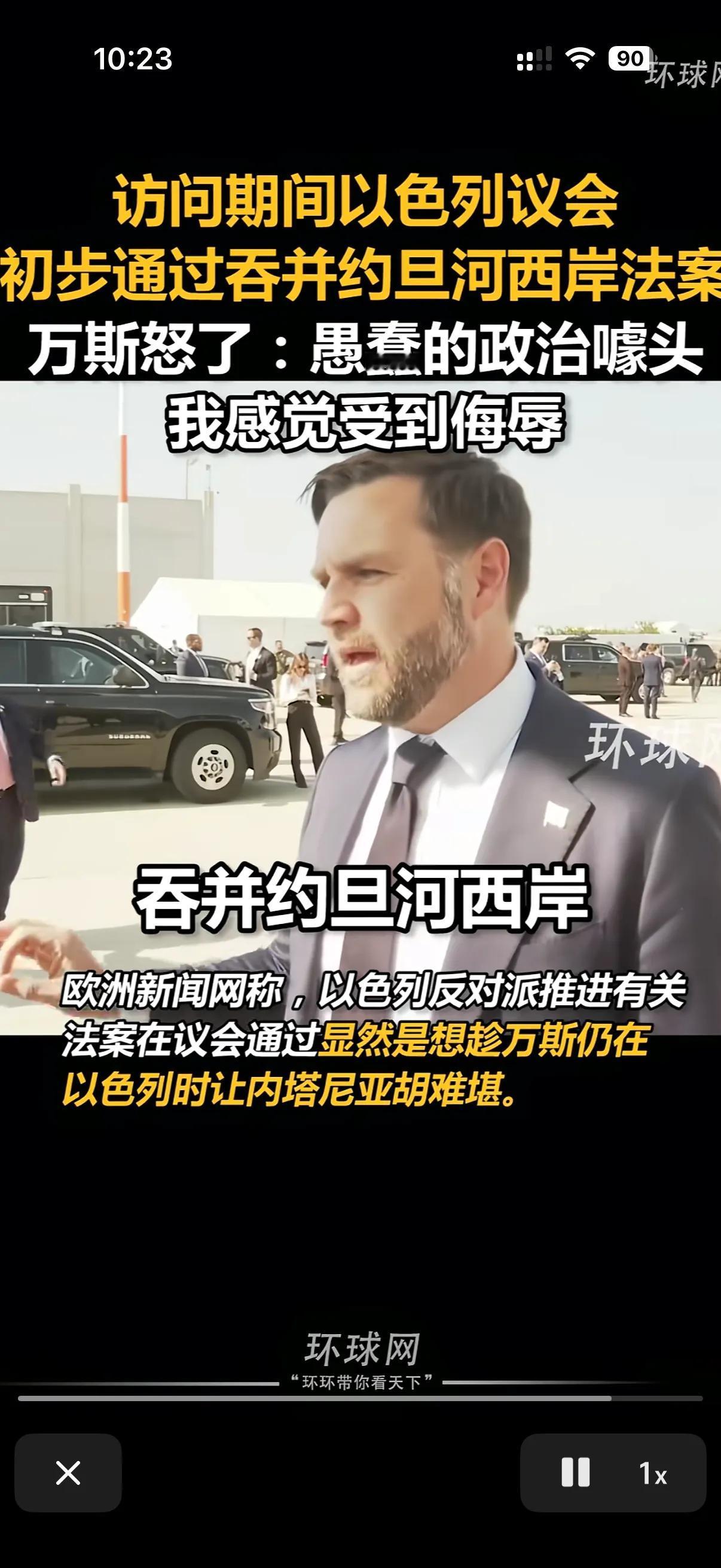 美国副总统万斯声称自己被愚弄了! 原因是在万斯监督以色列加沙停火协议的时候,以色列议会竟然初步通过了吞并约旦河西岸的法案! 这是打美国的脸,在打万斯老大特朗普的脸,更何况还是在万斯访问期间! 所以一气之下,万斯直接离开了以色列,至于监督以色列加沙停火协议,别闹了,以色列都开始研究吞并约旦河西岸了,万斯在那根本就起不到任何作用了,甚至还会被以色列拿来做文章,称这是美国支持的让以色列这么干的,那万斯不跑等啥呢! 所以万斯在上飞机前才会发表讲话称自己受到了侮辱,估计不上飞机前他也不敢说! 并且万斯声称,自己老大特朗普领导下的美国绝对不允许以色列吞并约旦河西岸做大做强的! 毕竟小弟强大了那老大可就危险了! 这让我想起当初的两伊战争了!这以色列越来越像众叛亲离发展了!
