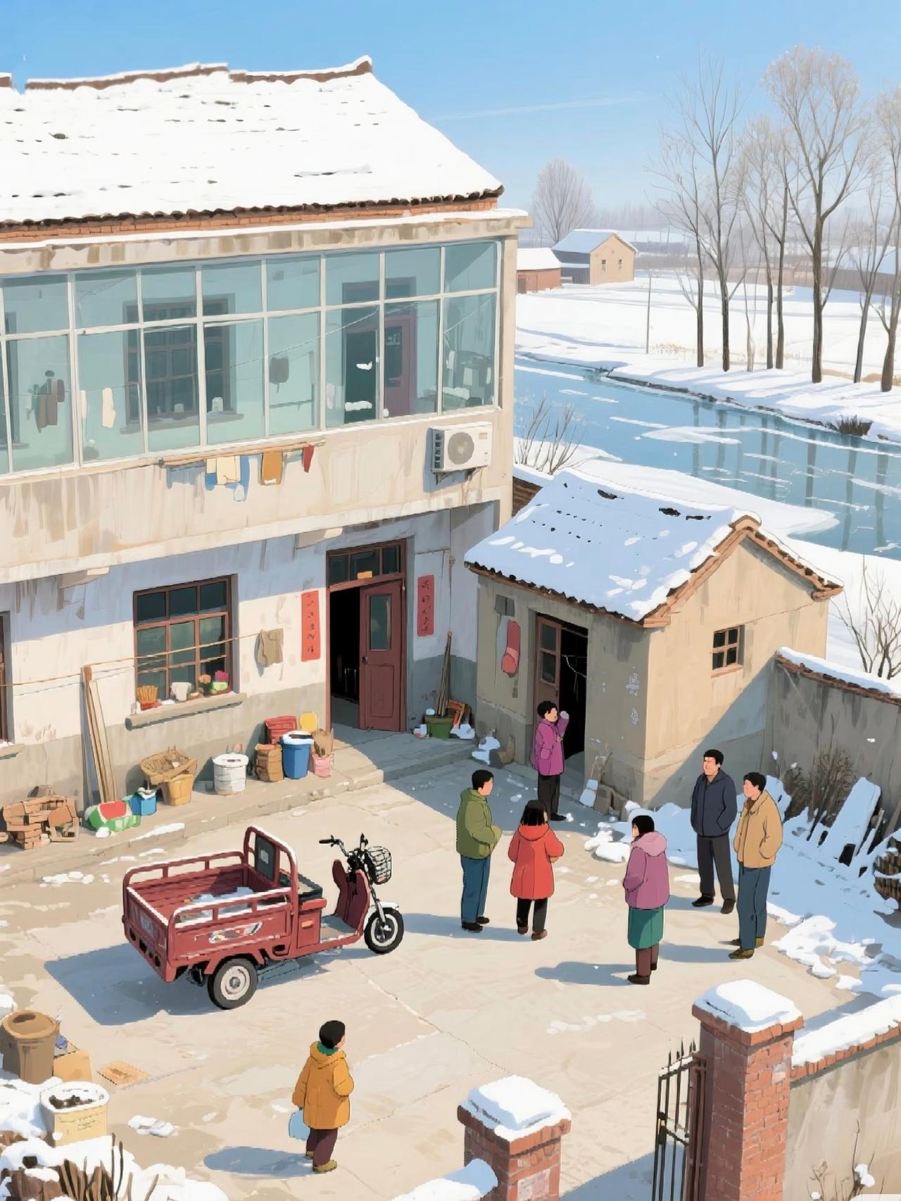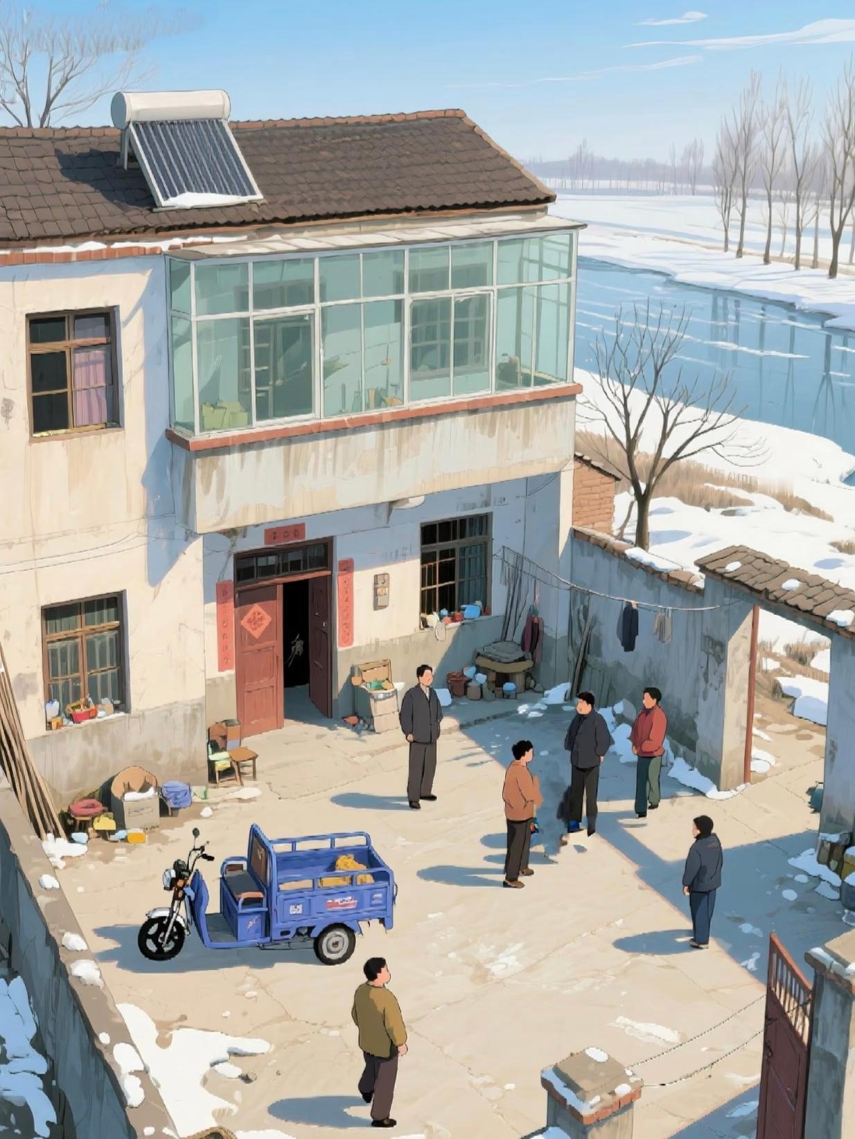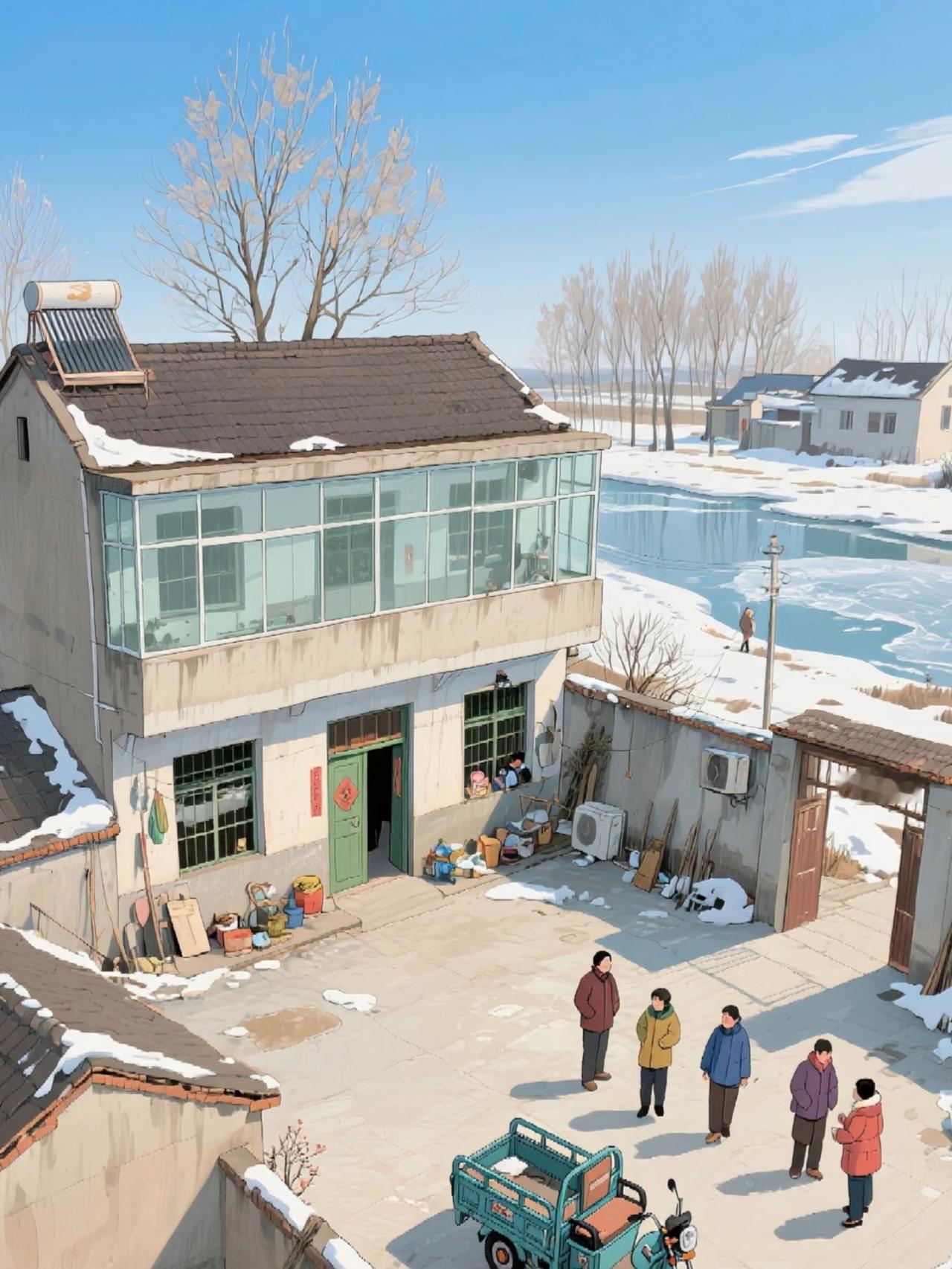 冬日的雪,是农村最素净的笔墨,轻轻落在村头那栋二层小楼的半封闭玻璃幕墙上,晕开一片朦胧的白。 在雪色里透出暖融融的光。朝南的半封闭玻璃区像个透明的匣子,铝合金框架嵌着整块玻璃,把寒风挡在外面,却将满院雪景框成了流动的画。雪粒子敲在玻璃上,沙沙响着,屋里的暖汽在玻璃内侧凝出薄薄的雾,又被人用手指划出歪歪扭扭的痕迹。 二楼的窗沿积了雪,像给窗框镶了道银边,玻璃反射着远处田埂的雪光,连屋顶的太阳能板都盖着层雪被,只露出边角的蓝。楼下的小菜园早被雪埋住,唯有玻璃区里摆着几盆冬青,绿得格外分明。偶尔有人推开玻璃门,带着一身寒气进来,门轴吱呀一声,惊得檐下的雪簌簌往下掉,落在门前的红对联上,红白相映,倒添了几分年关的热闹。 雪还在下,那栋小楼就静静立在雪里,半透明的玻璃墙里藏着烟火气,墙外是乡村的冬日长卷,冷得清冽,却暖得踏实。