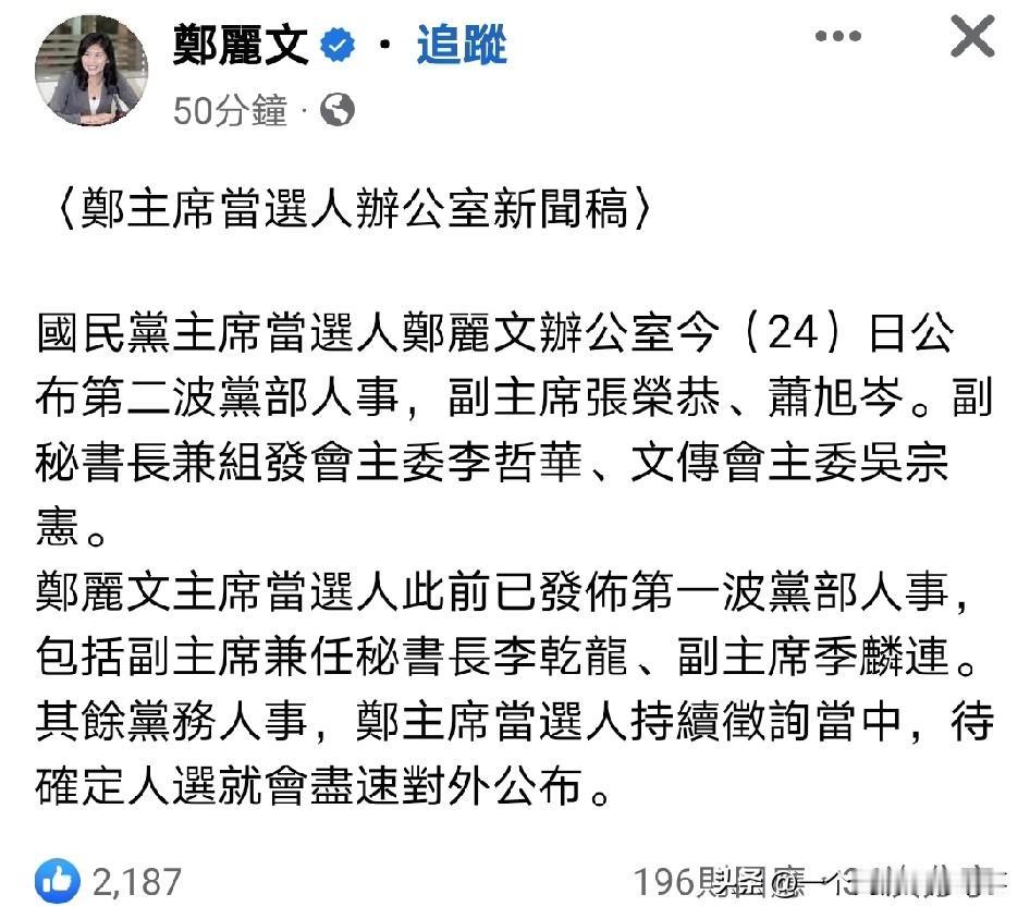 郑丽文第二波人事!连战马英九吴敦义侯友宜人马入列! 今天中午,新当选的国民党主席郑丽文发布第二波人事任免!原连战人马国民党资深大陆部主任张荣恭担任国民党副主席、马英九嫡系马办主任萧旭岑也担任副主席! 吴敦义人马(在吴敦义江启臣时期担任组发会主任)李哲华担任国民党副秘书长兼任组发会主委,国民党“立法委员”,检察官出身的亲侯友宜人马吴宗宪担任文传会主委。 至此,除了国民党本土派系,郑丽文的任命已经涉及国民党各派系,还有几个重要位置看第三波人事任免了。