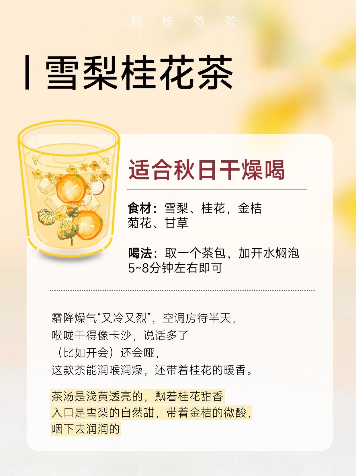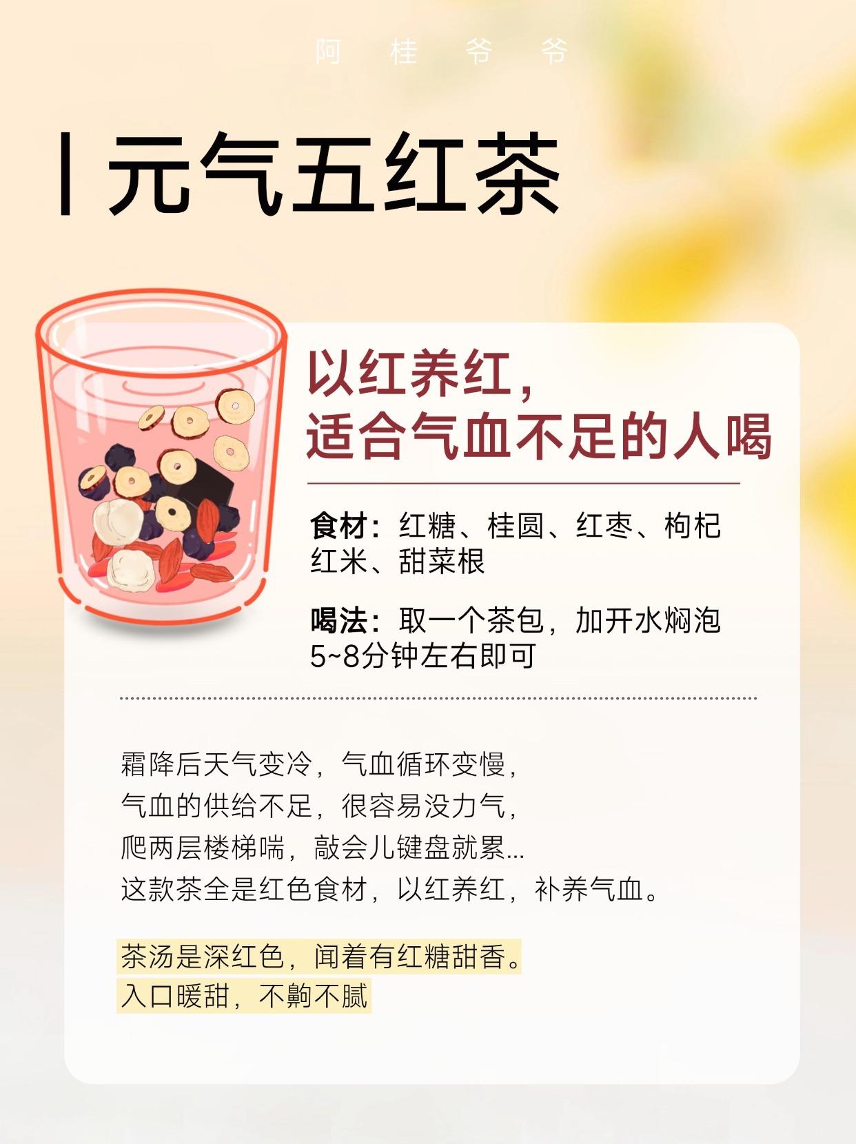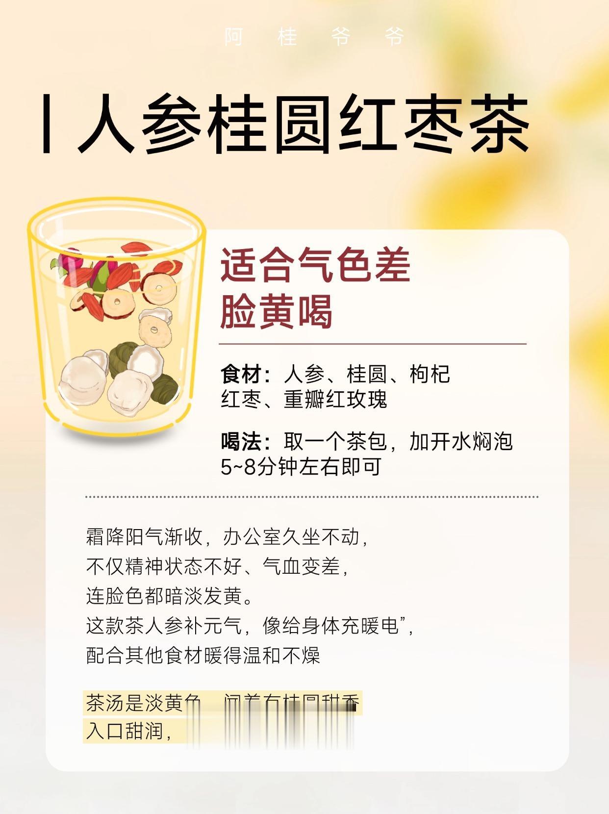 适合霜降节气喝的,6款办公室养生茶 霜降一到,天气像“裹了层冷霜” 早晚出门天气冷得更明显了,在秋天的燥气影响下, 脾胃不畅、没精神、嗓子干、皮肤干燥起静电的小毛病全都跑出来了啦... 整理了6款“适配霜降”的办公室养生茶, 免煮免洗,开水一泡就喝,赶跑节气小毛病,捧着暖杯上班才舒服~ 1、五指毛桃茯苓茶——脾胃虚 2、五黑黄精桑葚茶——肾气虚 3、雪梨桂花茶——空气干 4、胖大海橘红茶——嗓子干哑 5、人参桂圆红枣茶——气色不好 6、元气五红茶——气血不足
