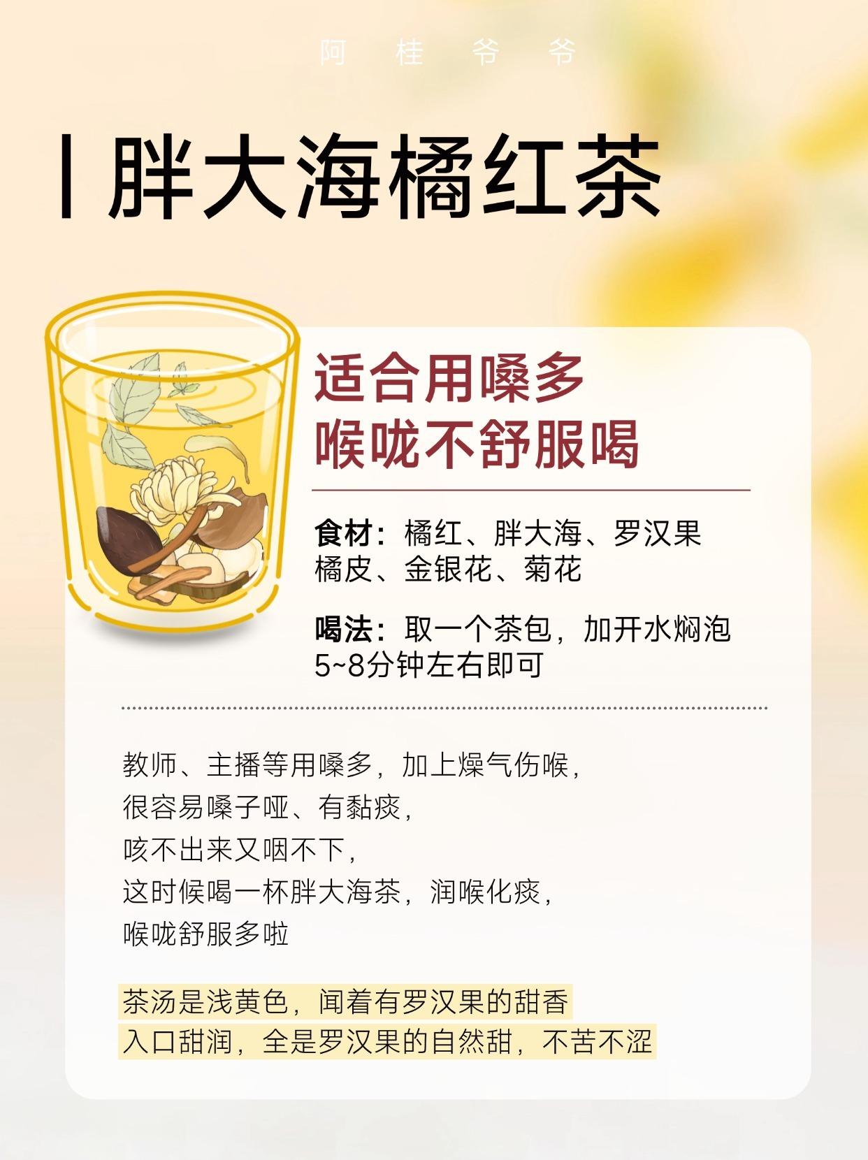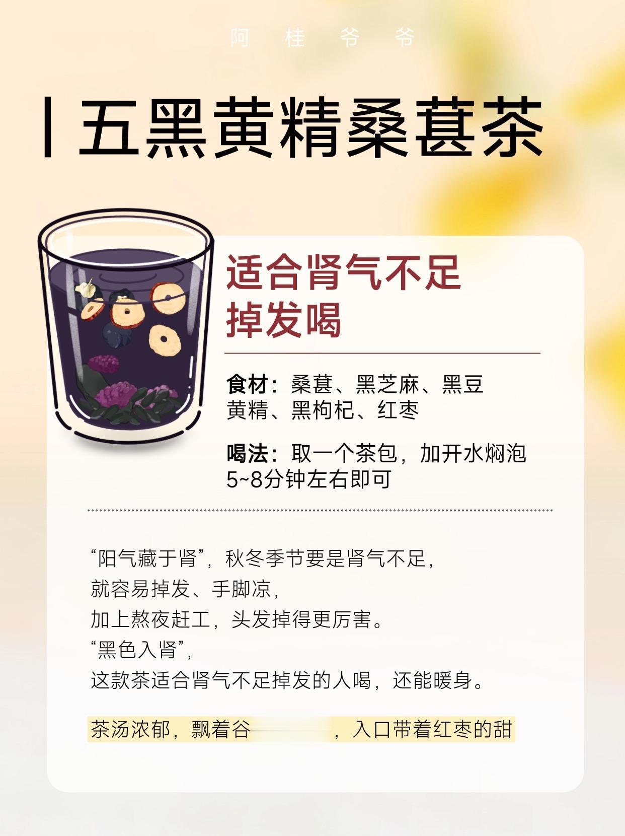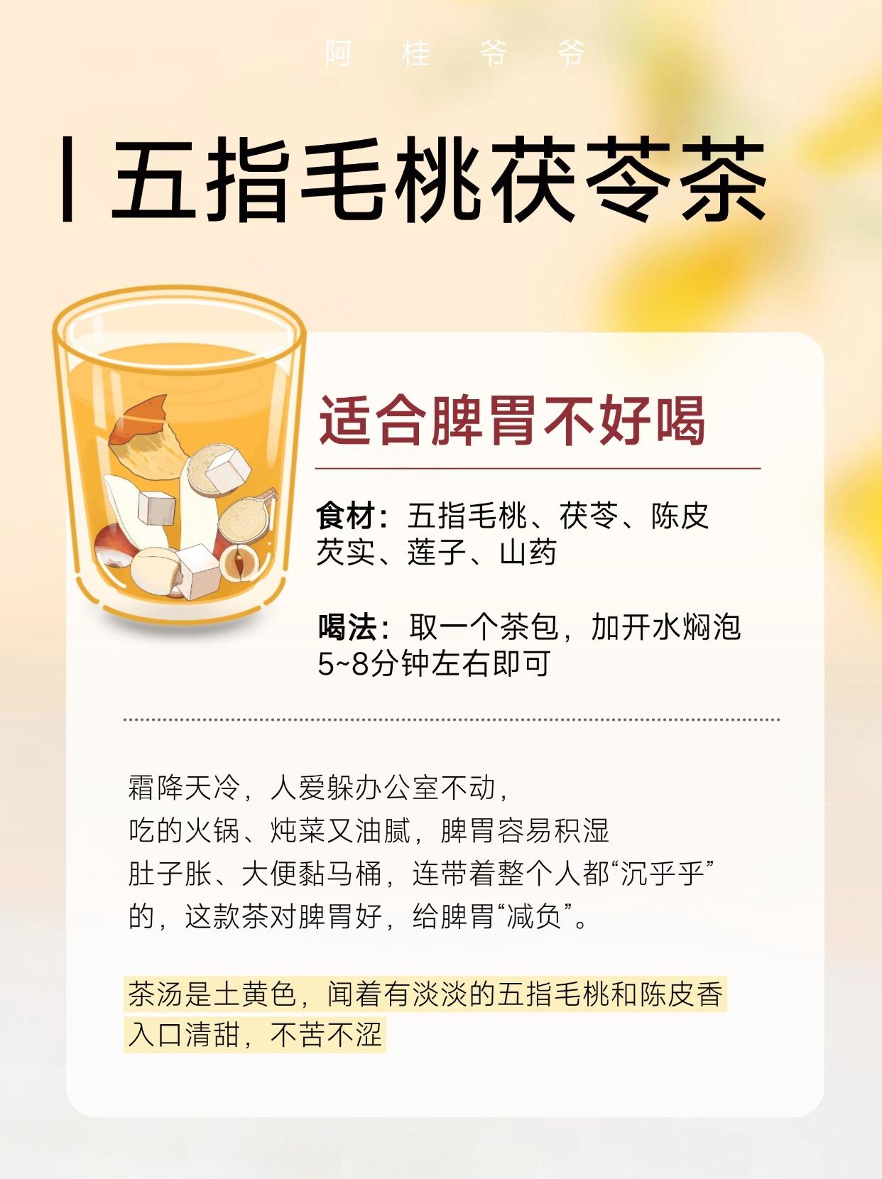 适合霜降节气喝的,6款办公室养生茶 霜降一到,天气像“裹了层冷霜” 早晚出门天气冷得更明显了,在秋天的燥气影响下, 脾胃不畅、没精神、嗓子干、皮肤干燥起静电的小毛病全都跑出来了啦... 整理了6款“适配霜降”的办公室养生茶, 免煮免洗,开水一泡就喝,赶跑节气小毛病,捧着暖杯上班才舒服~ 1、五指毛桃茯苓茶——脾胃虚 2、五黑黄精桑葚茶——肾气虚 3、雪梨桂花茶——空气干 4、胖大海橘红茶——嗓子干哑 5、人参桂圆红枣茶——气色不好 6、元气五红茶——气血不足