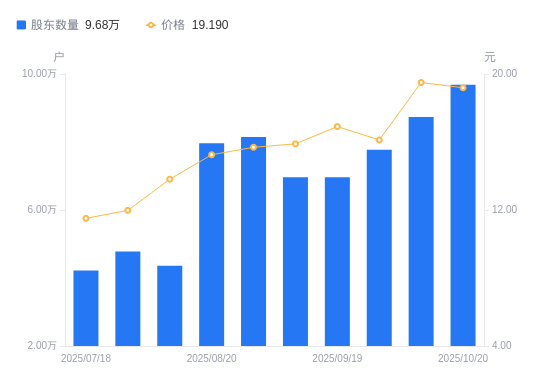 近一年(2024年11月20日至2025年10月20日),新疆交建A股股东户数从5.17万户,增加至9.68万户,增幅87.17%,区间股价上涨56.53%。