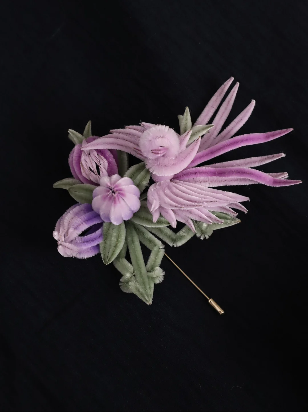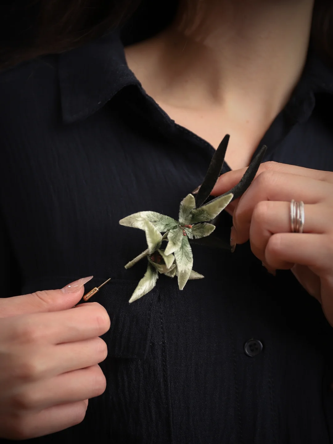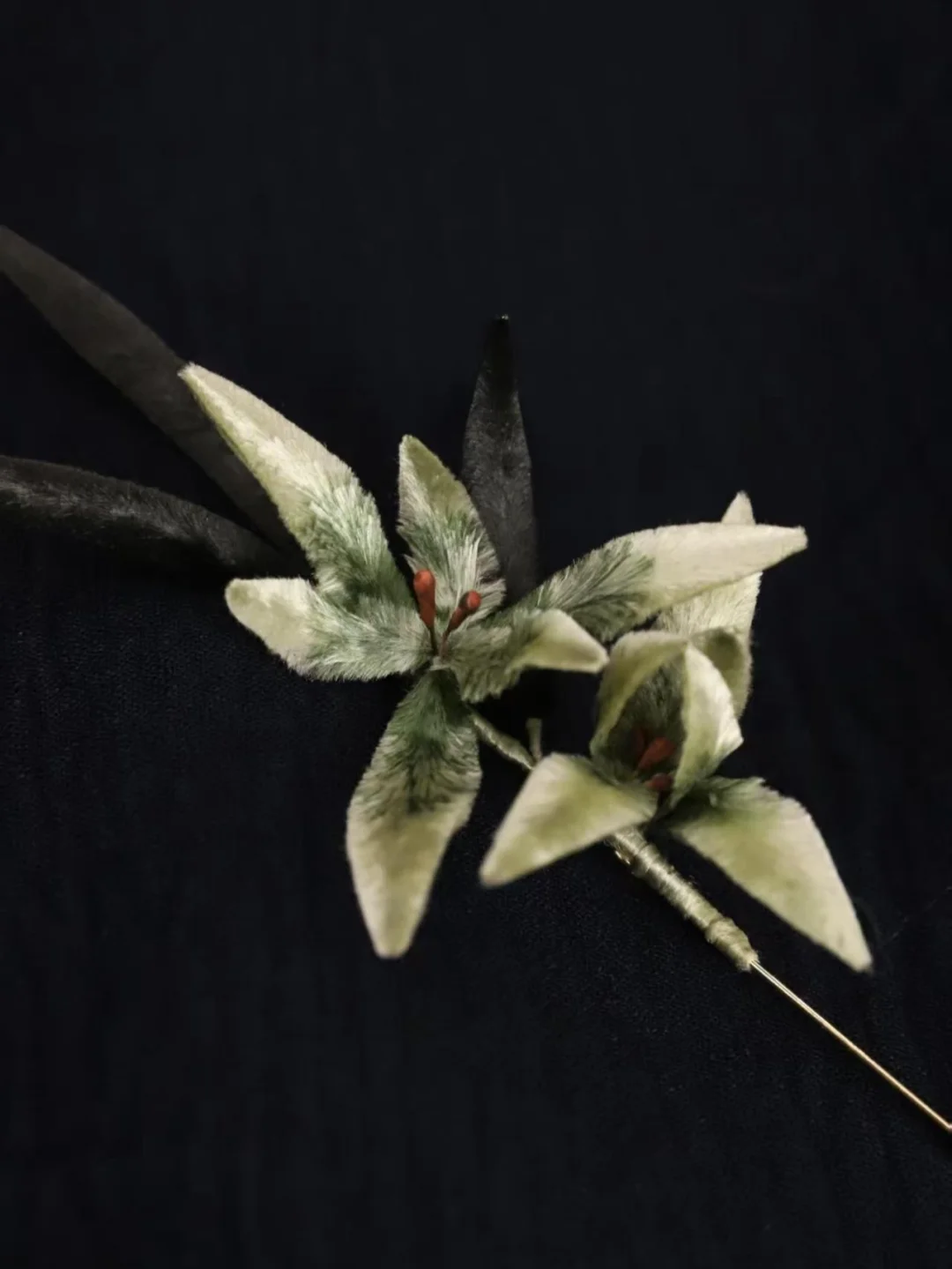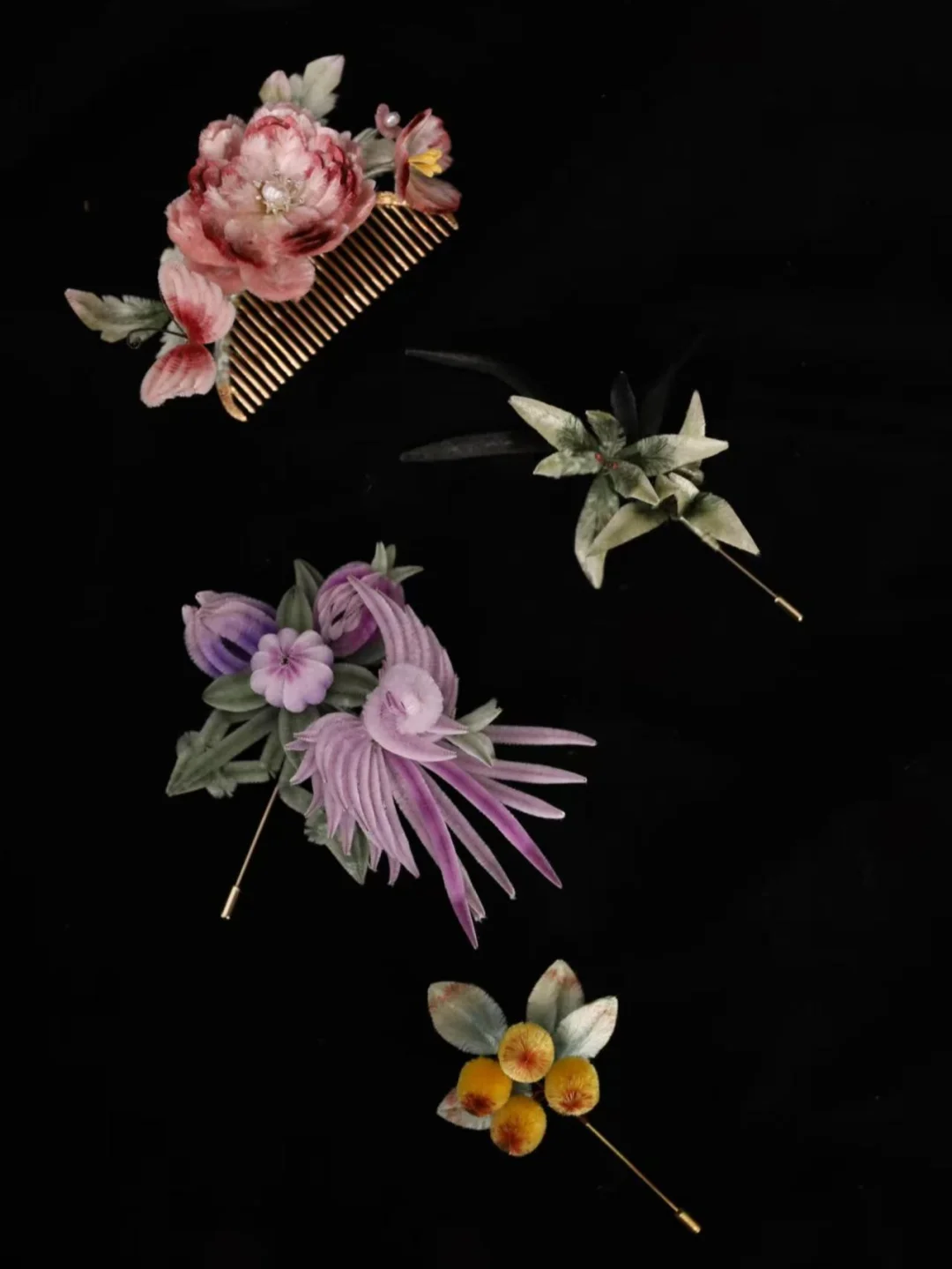 绒花的美丽 大概是看到的那一刻 天“花”板的花再无争议 一千多年前的老祖宗 爱花爱到骨子里 诞生了这雍容华贵的绒花配饰 从此中国女子的容颜多了一抹绝色 可惜快节奏社会人们把审美丢弃了 一件绒花需经过染色、下条、打尖、 等十多道纯手工工序 蚕丝在匠人指尖被赋予生命 制成花瓣的细腻纹理甚至胜过真花 这种手工的细节与质感 是流水线饰品永远给不了的温柔 日常可佩戴的幽兰胸针、春桃发夹、枇杷发簪 简单却不失精致 举手投足间的小搭配 福寿三多和摇钱树则是大开气场 适合生命中的重要时刻~