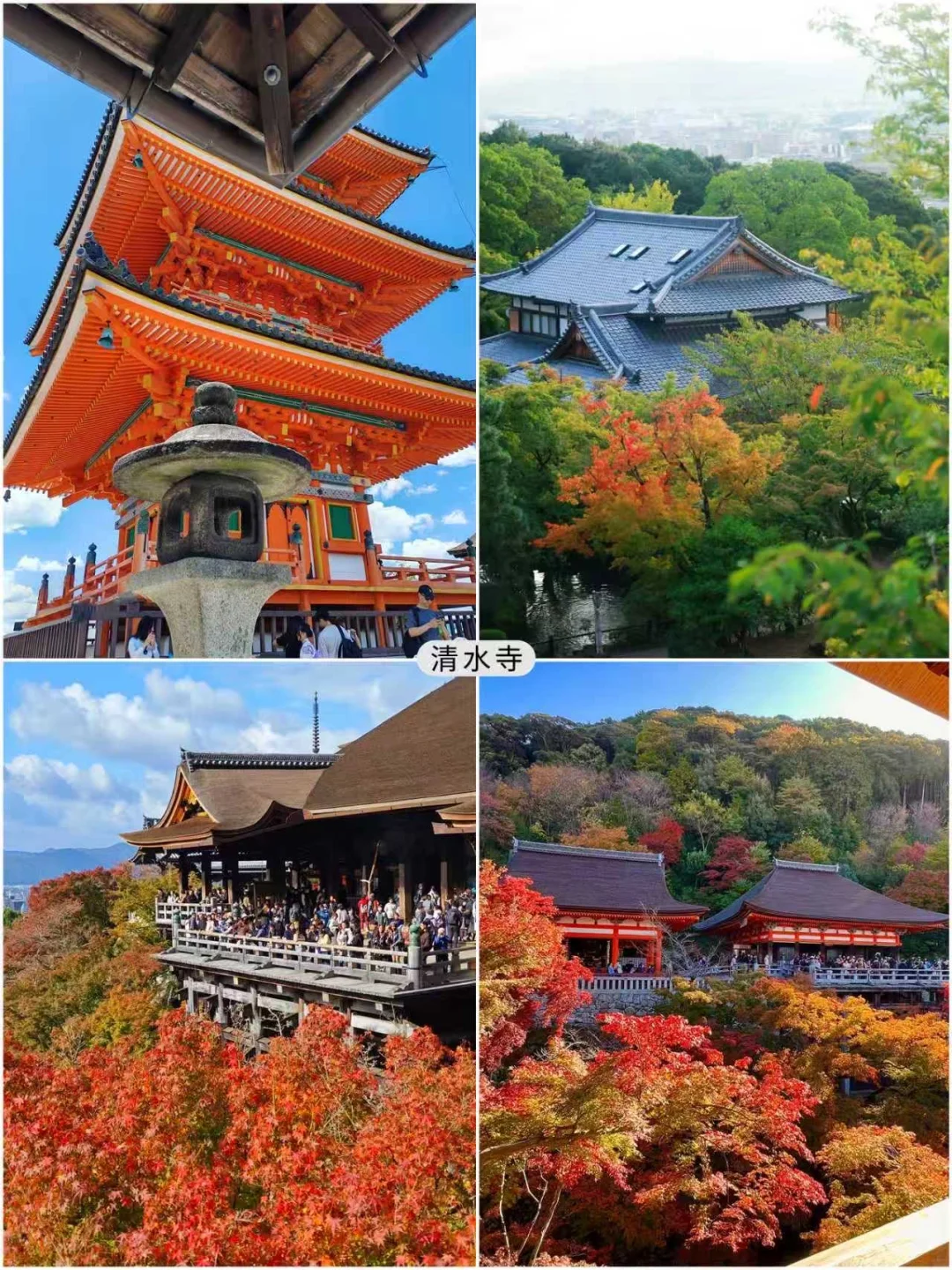 💡京都清水寺:是京都的标志,是一座千年古刹,清水舞台为悬空结构,可俯瞰京都全景,旁边的地主神社求姻缘超灵,还可以体验摸“恋爱石”的趣味