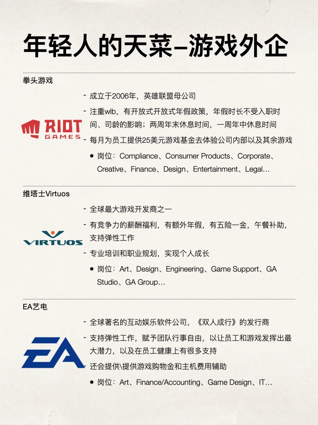金九银十找工作,来看看游戏外企吧,不只为做游戏,更为一种理想的生活方式,高年假、不内卷、超包容,真的就是年轻人的职场乌托邦 . 为什么建议试试游戏外企 ✅年假15天起步,带薪病假也大方,拒绝996,不内卷不加班,每周都有居家办公机会,专属游戏福利+节日主题活动,环境包容,门槛友好 . 坚持日更✊🏻,帮大家在找工作路上顺利拿到offer! .