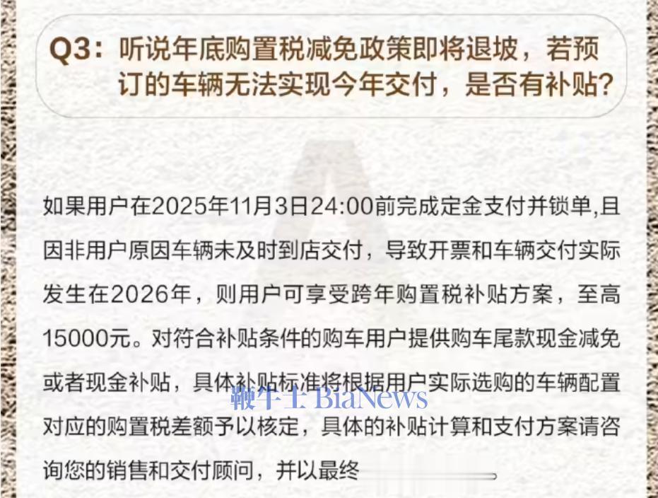 如果用户在2025年11月3日24:00前完成定金支付并锁单,且因非用户原因车辆未及时到店交付,导致开票和车辆交付实际发生在2026年,则用户可享受跨年购置税补贴方案,至高15000元。