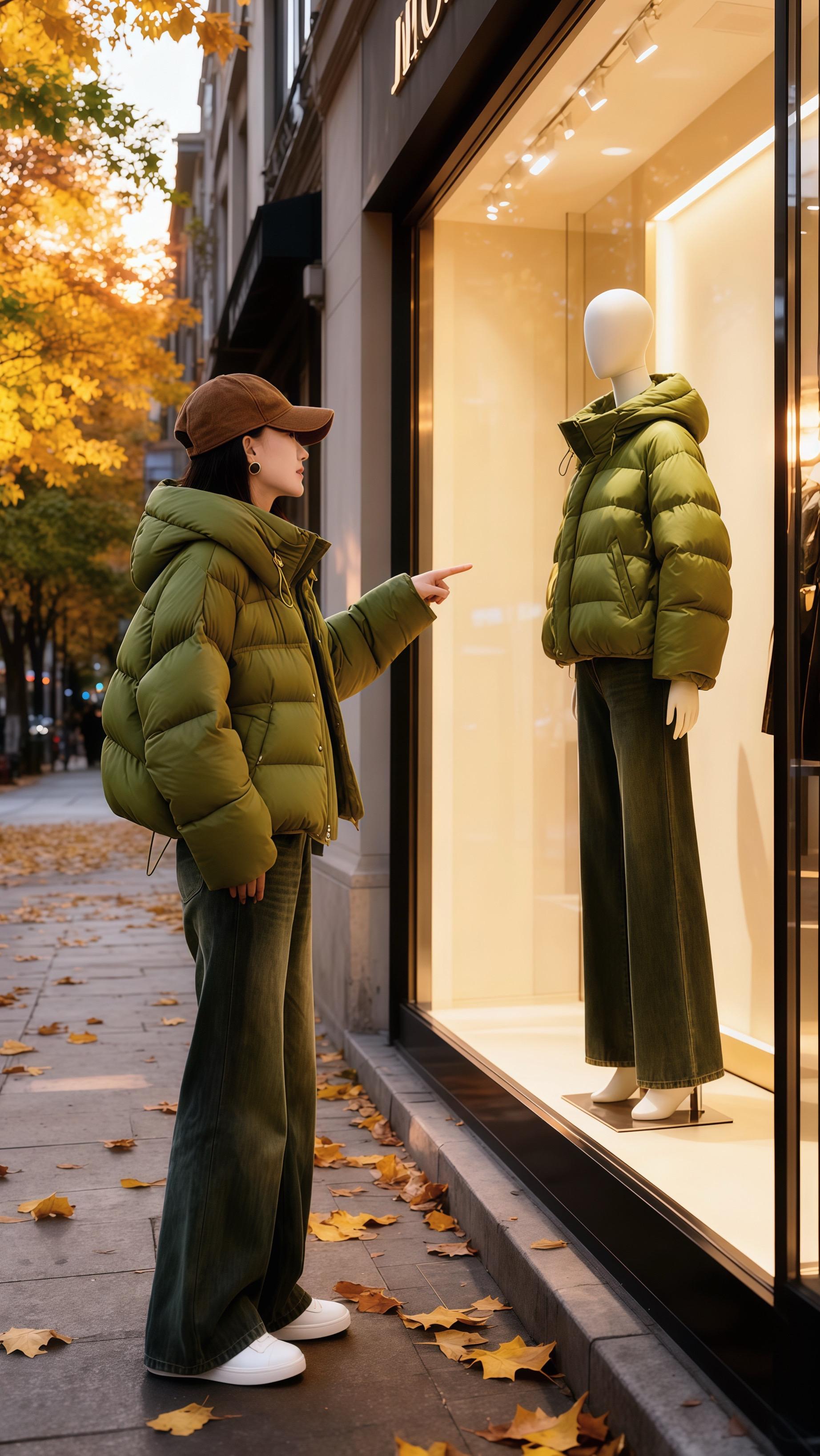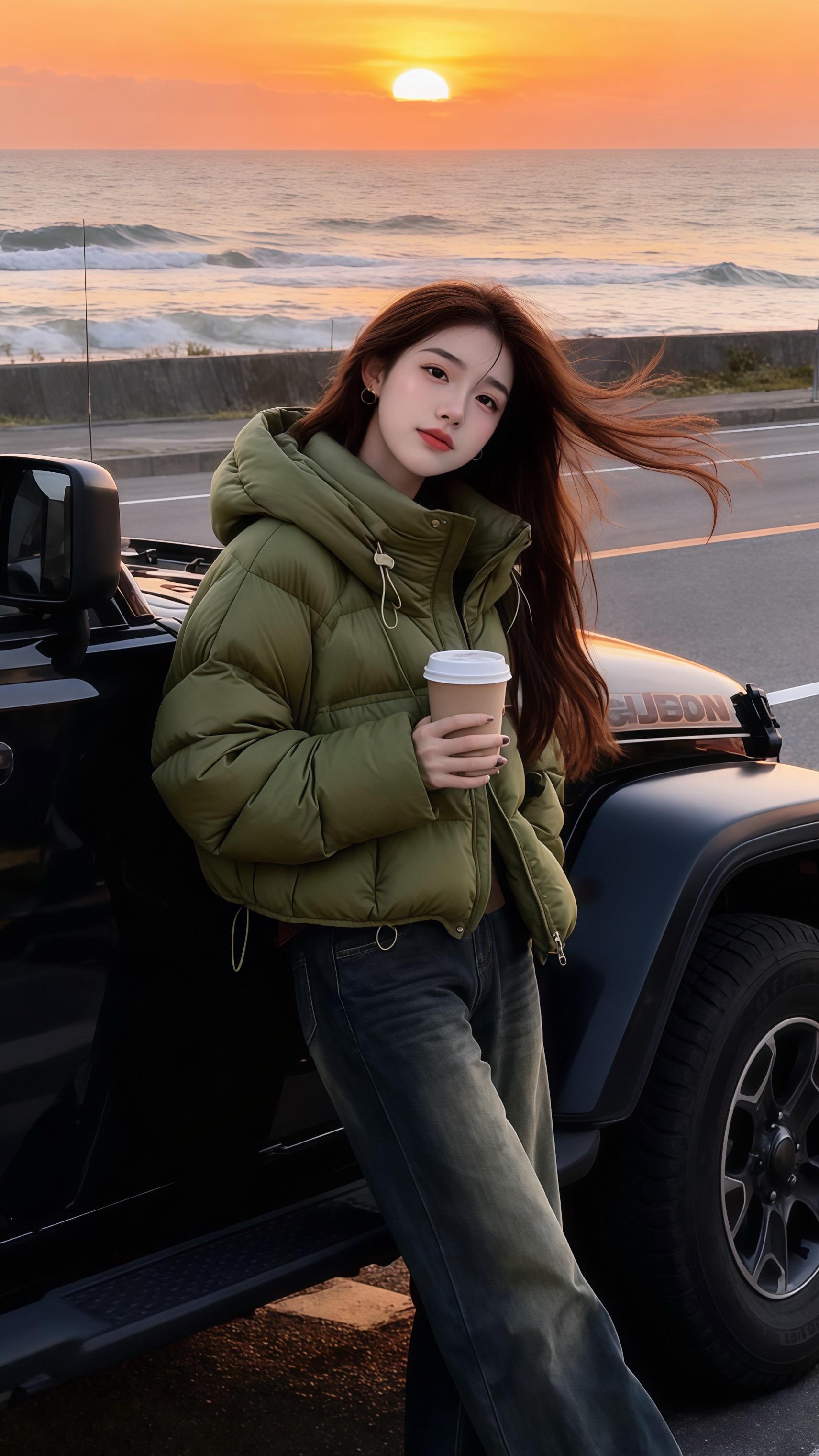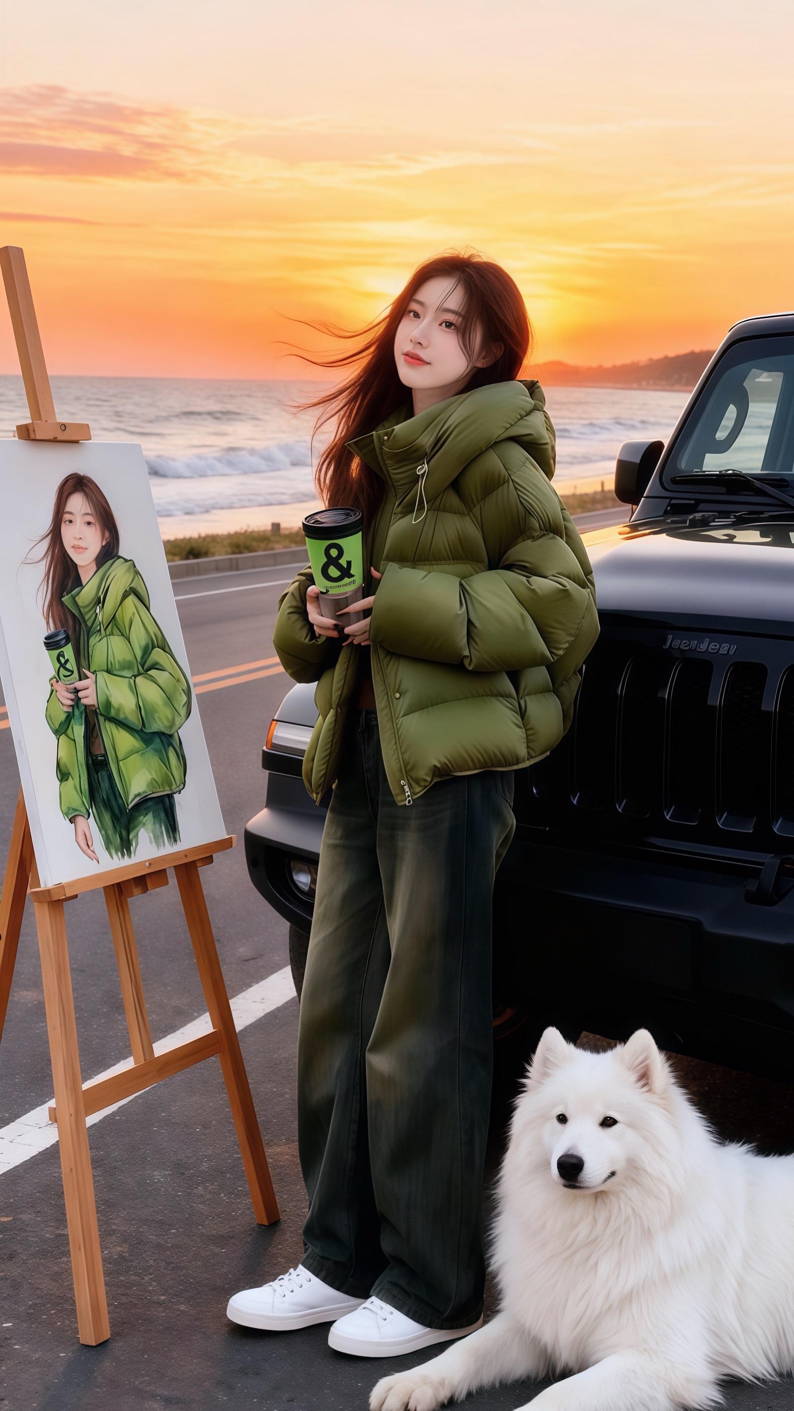 《穿这件牛油果绿羽绒服,她在深秋活成了偶像剧女主》 深秋的梧桐街,落叶铺了一地金黄。林晚盯着橱窗里那件牛油果绿羽绒服,指尖不自觉地指向模特——下一秒,她就穿着同款站在了海边公路。 黑色Jeep停在一旁,萨摩耶在脚边撒欢,画架上的肖像画把她的穿搭复刻得一模一样。落日熔金,海风掀起她的发梢,手里的咖啡杯氤氲着暖意。从梧桐街的橱窗心动,到海岸线的自由驰骋,这件羽绒服成了她的“魔法外套”。 ootd穿搭灵感里,她把深秋的松弛感穿到了极致。有人说这是“穿搭即生活态度”,有人羡慕她把日常过成了旅行大片。而林晚知