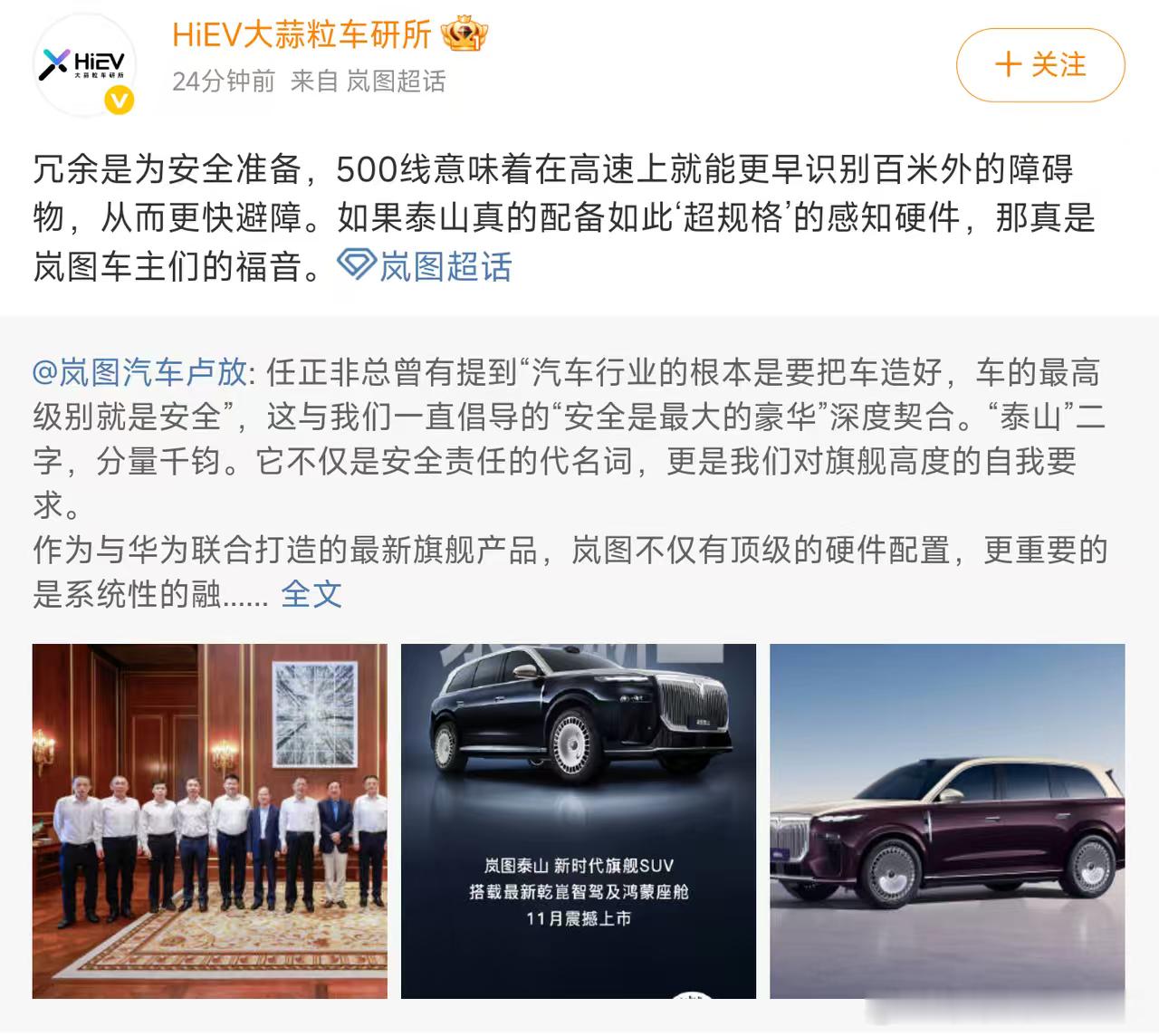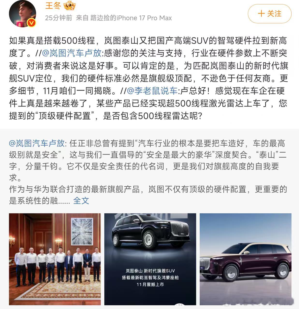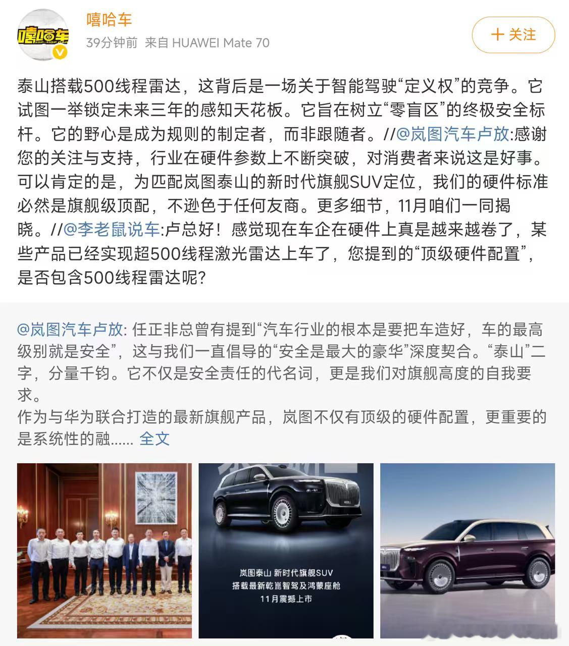 许多汽车行业的专家都在转发岚图汽车董事长卢放的微博,看起来是在讨论即将于11月上市的岚图泰山。据说这款新车可能配备了500线激光雷达以及最新的华为智能驾驶系统和鸿蒙座舱?目前市面上最强的设备也才达到192线,这简直是翻了一番!这样的配置真是让人不敢小觑,我已经迫不及待想看看实车了!