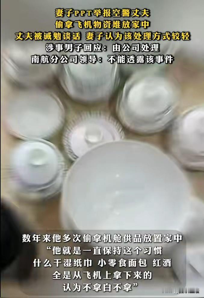 得罪女人真可怕!女子与空警老公,分居 28 个月,离婚不成!写65页ppt举报老公,把飞机上的小零食,红酒,纸巾等拿回家! 女子网名“沉舟侧畔”,她和老公王某离婚,有28个月了,离婚进入僵局! 遂实名举报,王某私拿公司物品,想着公司能惩罚他,或者开除! 公司用时13个月“调查”,空警王某确实有私拿,遂作出诫勉谈话处理,让他归还拿走的东西! 女子不服,认为判的太轻,继续举报! 评论区炸开了锅! 大家说,这女子想离婚,魔怔了吧!就这么着急啊? 还以为什么有大事?这女子用了65页ppt,都没有翻出枕边人家暴,出/轨, 起码证明王某,是个顾家的好男人, 得罪女人真可怕, “沉舟侧畔”为了离婚,这是要把老公的工作也断送了啊! 这个女人是不是找好了“下家”,等不及了,男子不离,所以才想把男子工作搞丢? 这心眼也太不够使唤了?