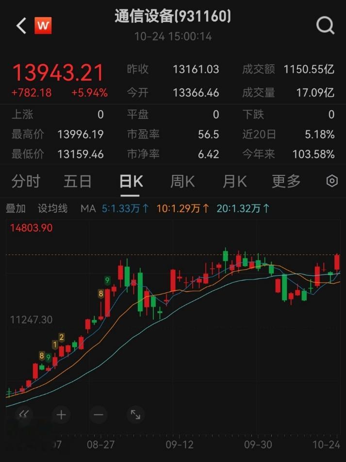 10月24日,通信设备指数(931160)跟随A股大科技板块强势走高,在市场整体放量上涨的行情中实现显著上行,截止收盘,涨幅5.94%。此次指数走强一方面受益于AI算力需求增长带动光模块等细分领域景气度提升,另一方面叠加市场对通信设备行业政策红利与技术突破的预期,板块整体呈现出强者恒强的结构性特征。