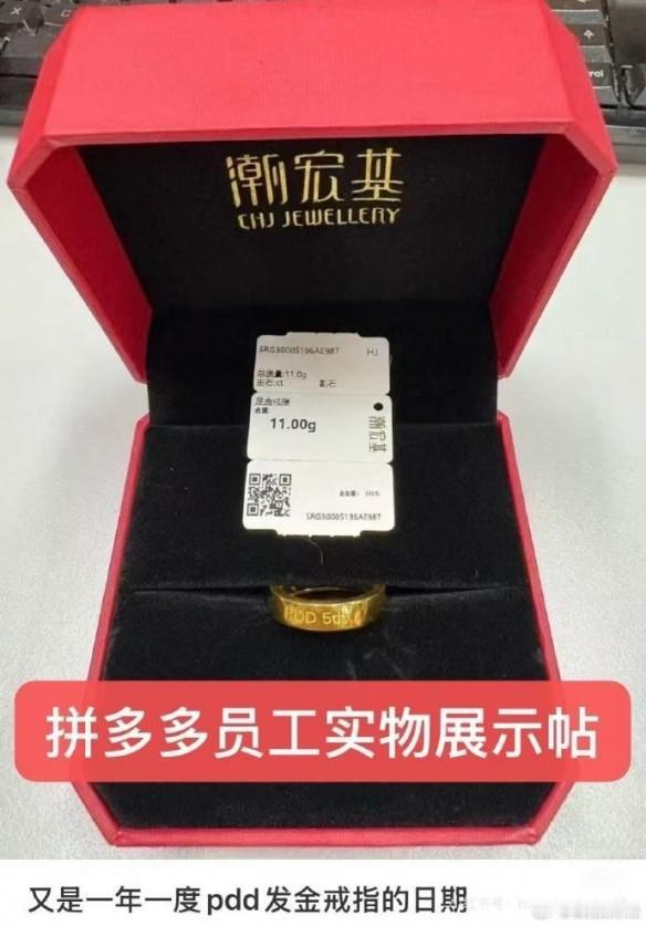 还是那个连砍50多刀砍不赢的拼多多了么,竟然给员工发金子! 拼多多在2024年10月迎来公司成立十周年(部分信息提及为“9周年庆”,但多方证实实际按十周年计算),为此向员工发放了极具分量的周年纪念礼——黄金制品。 根据员工入职年限不同,发放的黄金礼物分为三个档次: 入职满3年:获赠一枚刻有姓名的金戒指,重量约为 4–5克; 入职满5年:获赠一枚更大规格的金戒指,重量为 10–11克(不同来源略有差异); 入职满10年:获赠一只“金鸡”造型纪念品,重量高达 60–100克(最新消息倾向于100克)。