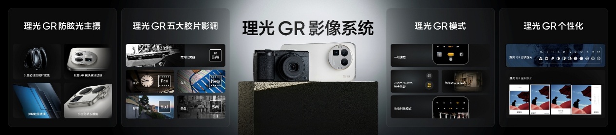 理光GR影像系统的定制,贯穿光学、算法、影调与交互多个层面。这颗5000万像素的防眩光主摄采用7P镜头结构与五层超低反镀膜,反射率低至0.2%,镜头玻璃覆盖双层AR镀膜,透光率达97%,这一设计让逆光拍摄时,画面始终保持洁净无鬼影,暗部细节保留完整,光影还原更接近人眼所见的真实效果。此外,还有标准、正片、负片、单色以及高对比黑白五种胶片影调,且每种影调都能自定义参数,轻松调出专属自己的“街拍配方”。