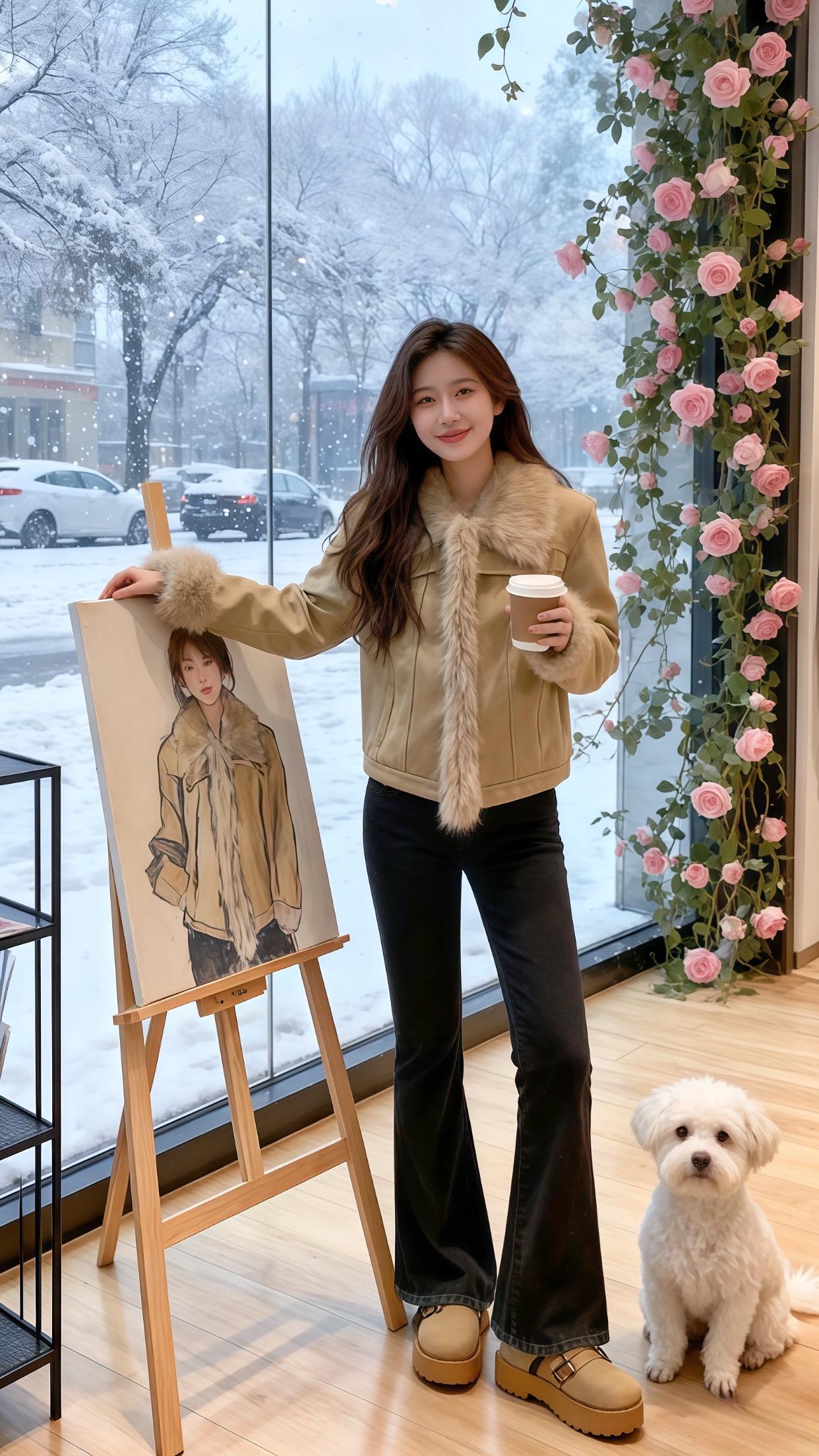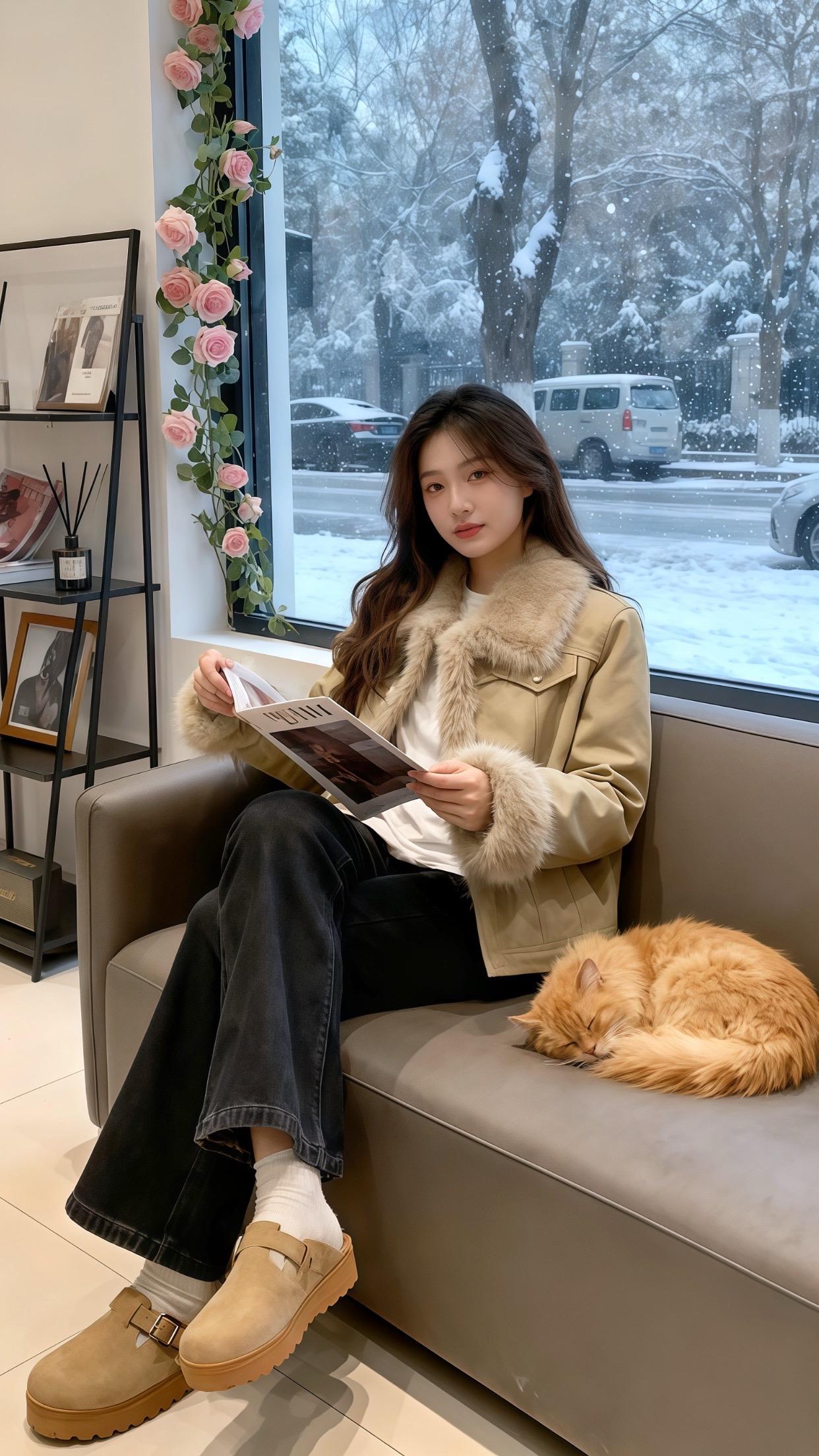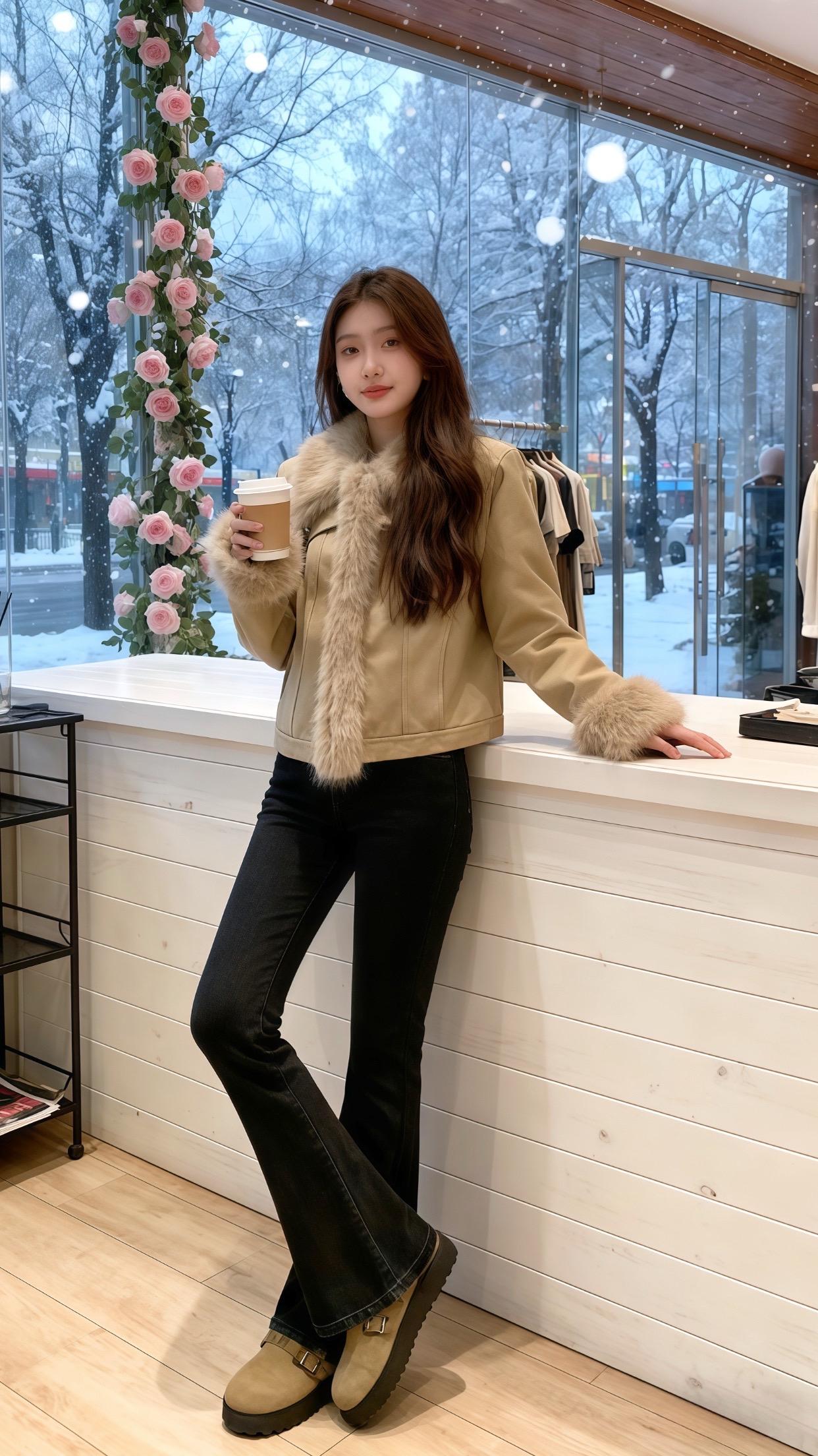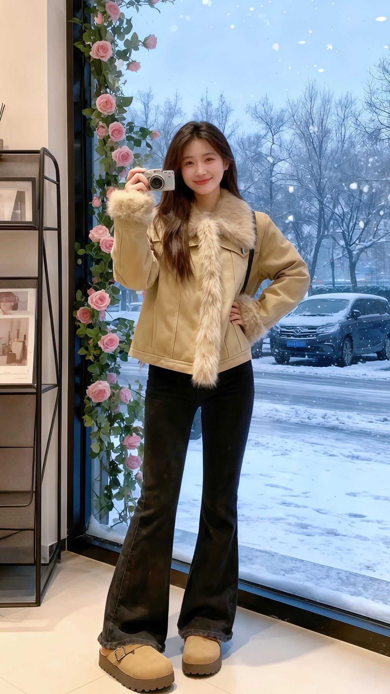 姐妹们谁懂啊!这件米色皮草领短外套简直是冬日穿搭作弊器—软乎乎的皮草领裹住脖颈,瞬间把冷空气隔绝在外,麂皮质感的衣身又添了份韩系的慵懒松弛感~斜挎黑色小包,再戴顶简约白帽,就是“毫不费力的时髦”本人!